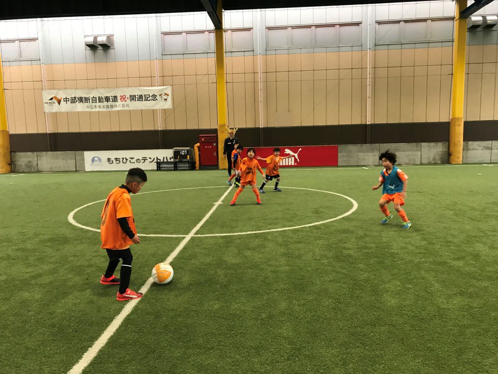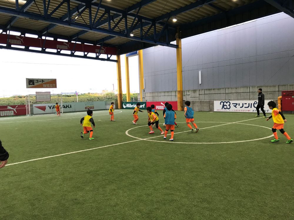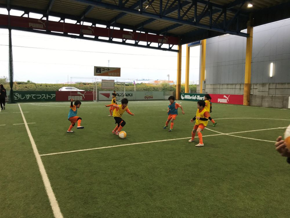 清水エリア(清水・静岡瀬名)から21名、静岡エリア(静岡・静岡聖一色)から13名、計34名のスクール生が参加し、6チームに分かれ、6vs6のゲームを各チーム5試合行いました。