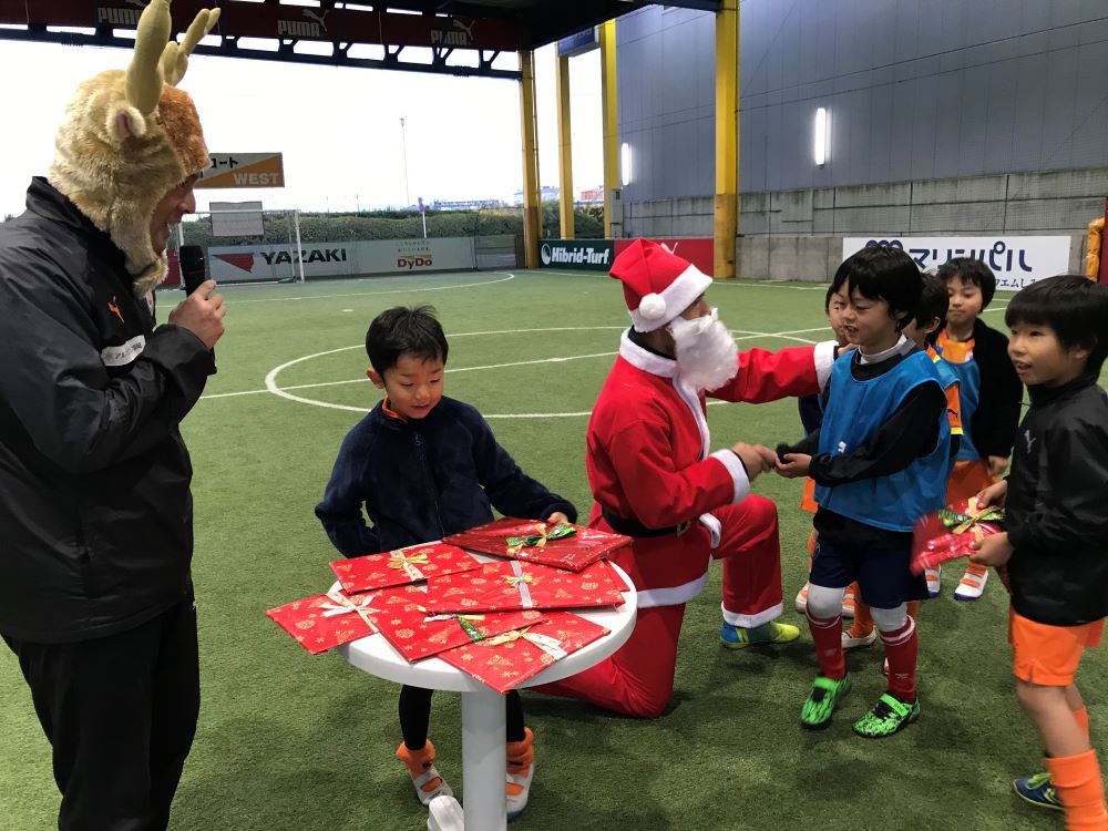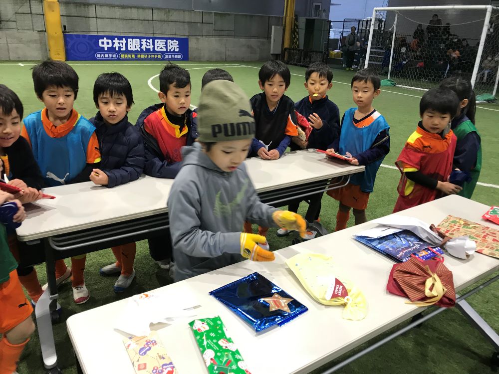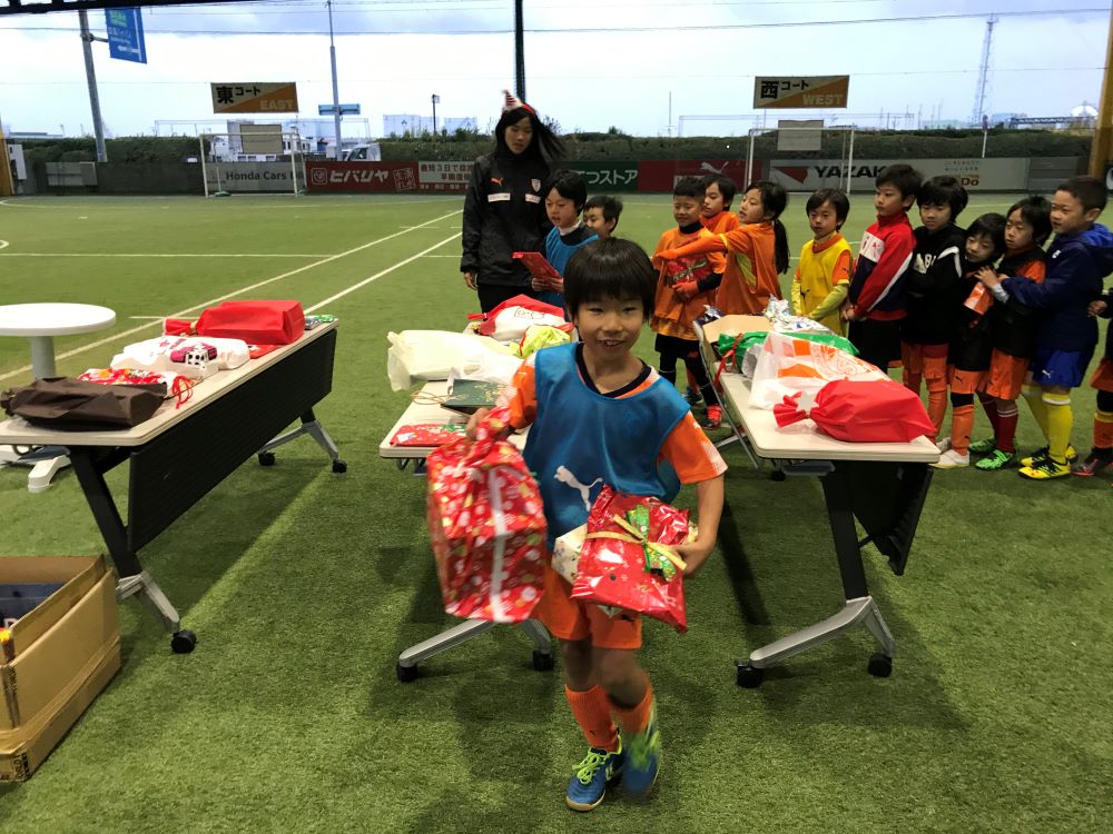 試合後にはクリスマスプレゼント抽選会を行いました。サンタさんが抽選箱からくじを引くときに子どもたちは当たってほしいと必死に願っていました。当たった子はとても嬉しそうにプレゼントを選んでいました。帰りには子どもたちが持ってきたクリスマスプレゼントでプレゼント交換をし、一人一つ選び嬉しそうな表情で解散しました。
