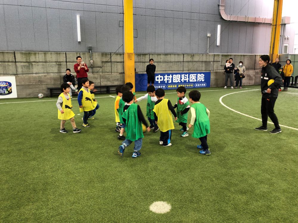 最後に、親子対決で試合を行いました。お父さん・お母さんのボールを奪いに行ったり、シュートをたくさん決めていました。シュートが決まるととても嬉しそうで、「もう1点とる!」とまた一生懸命にボールを追いかけていました。ラスト5分間は子どもだけで試合を行いました。ボールフィーリングで習ったドリブルやキックをしている場面をたくさん見ることができました。見ていたお父さん・お母さんは子どもたちの頑張っている姿に感動されていました。