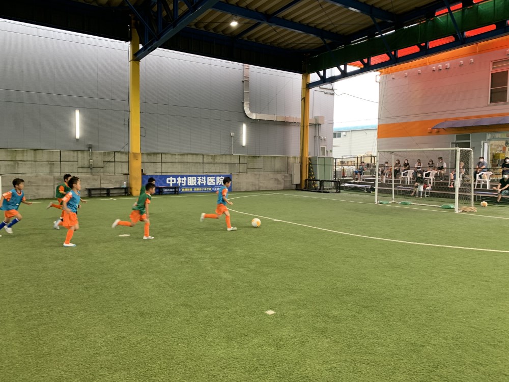 最後は2か所に分かれて試合を行いました。点を取ったら続けて試合ができるという、3チームでまわす形式のため、子どもたちは1試合でも多く試合ができるように積極的にゴールへ向かっていました。トレーニングで学んだことを活かせるよう、一所懸命取り組んでいました。終了時には、「ボールをたくさん触れてよかった。」「疲れたけれど楽しかった。」といった声が聞かれました。