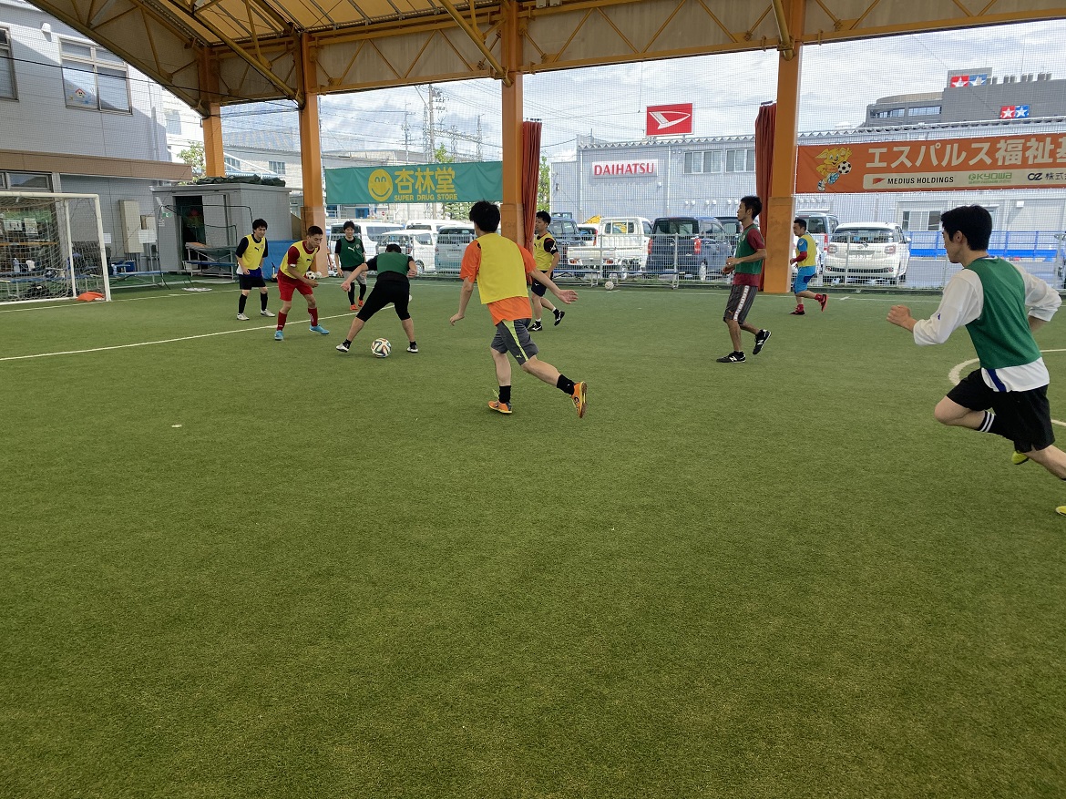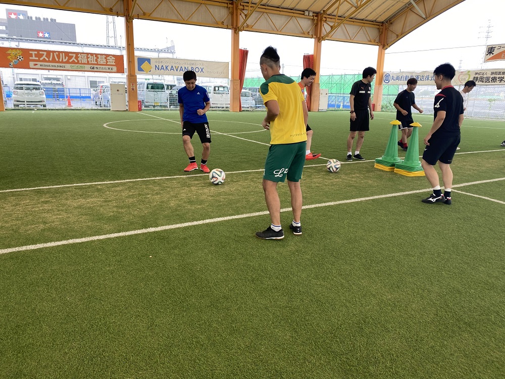 ウォーミングアップ、技術練習、対人、試合という流れは基本的に変わりませんが、毎月テーマがあり練習メニューが毎回違う点が本クリニックの魅力的な部分であり、今回のメニューの1つであったパス&コントロールの練習では、リピーターの方はボールを置く場所やコントロールの仕方など更に細かく具体的な部分を自分で突き詰めていく様子がうかがえ、初参加の方は技術習得に向けてコーチからのアドバイスを意識し、反復して動作の確認をするなど真剣に取り組んでいる姿が印象的でした。