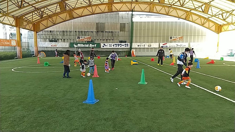 ウォーミングアップでは、親子体操から、親子手つなぎドリブル。その後、親子ドリブルからの宝探しでは、親子で協力しながら巧みにお宝を探し当てる姿が見られました。