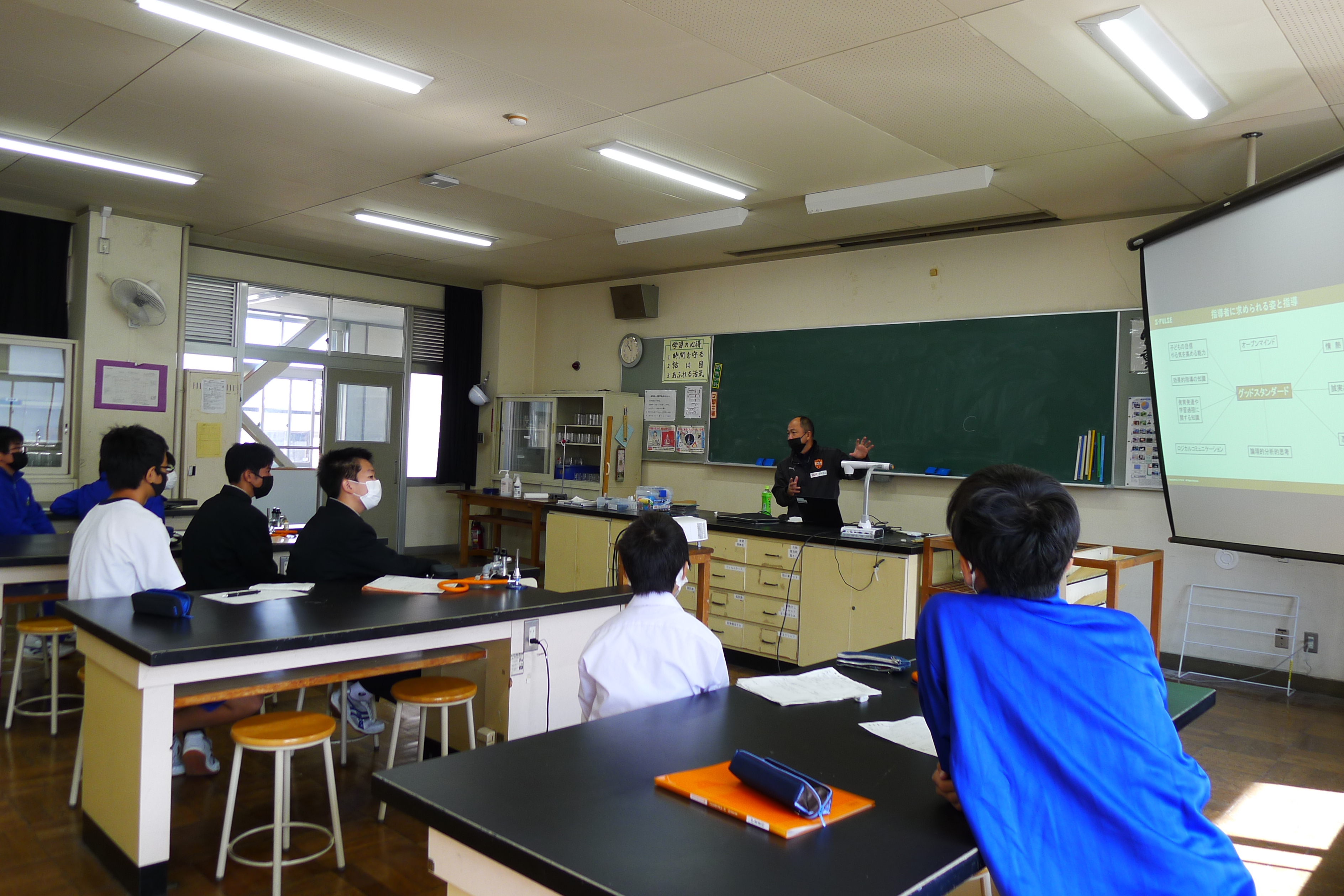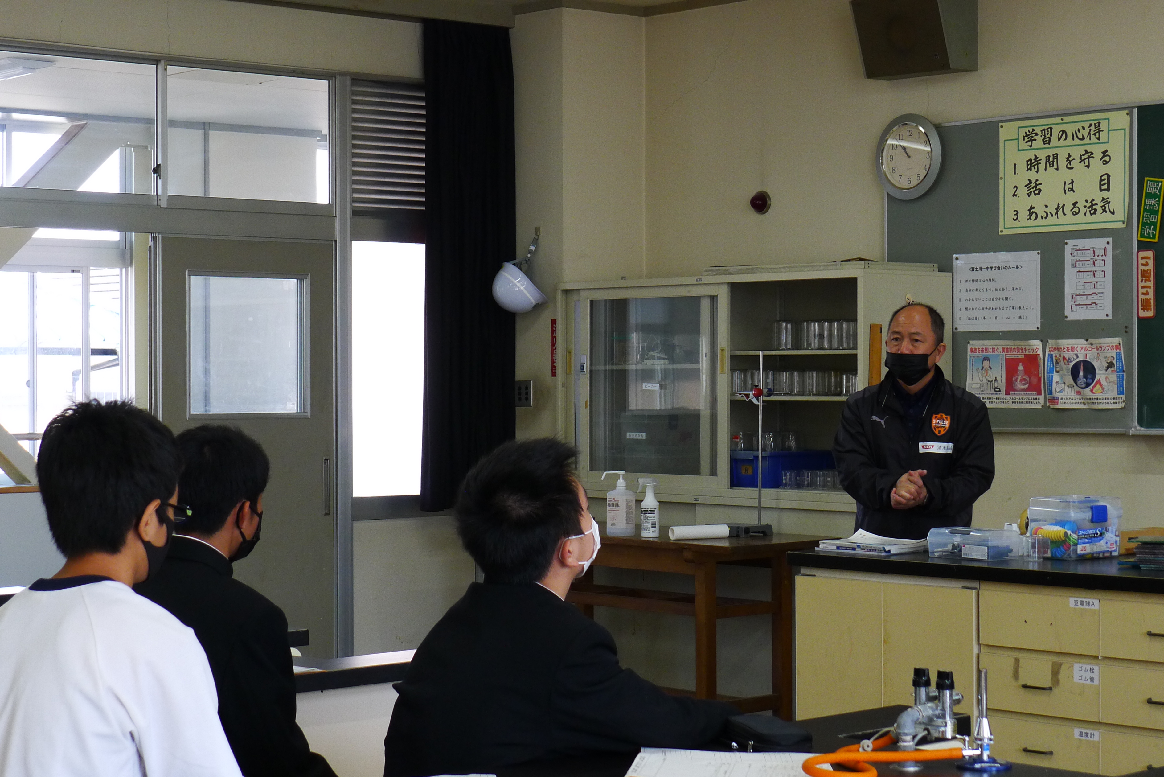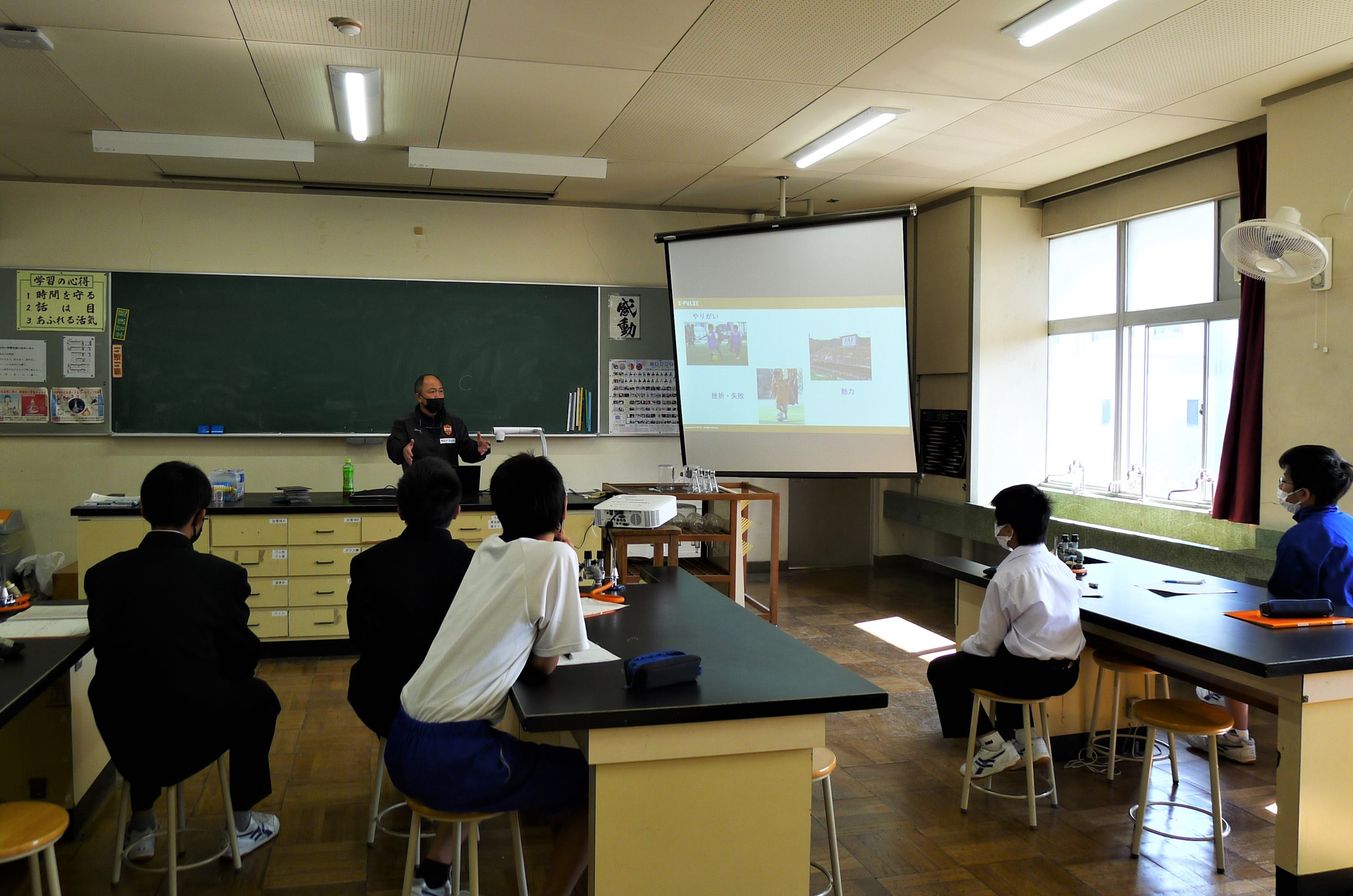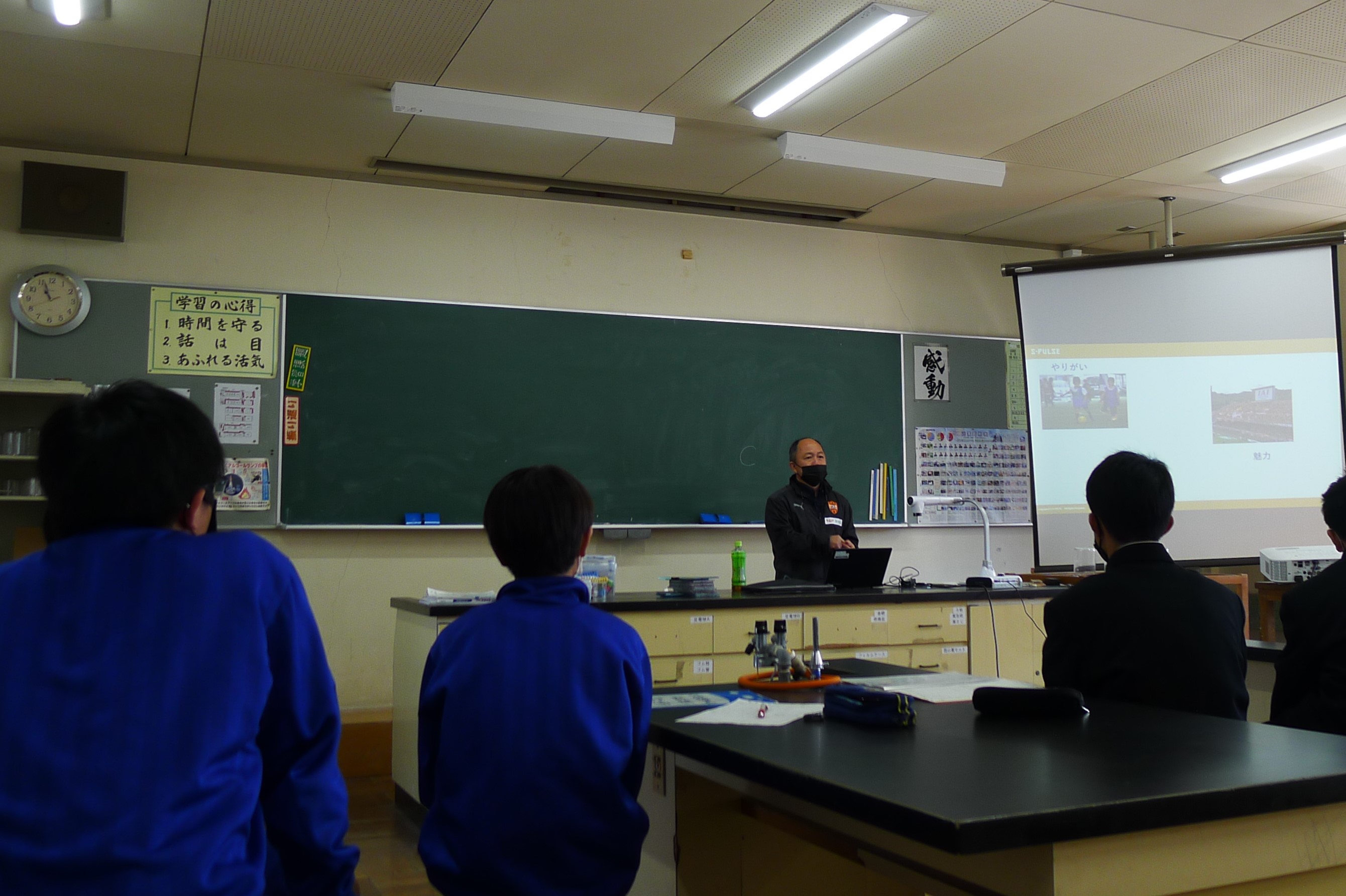 11月4日(木)、エスパルス教育事業部の今泉幸広ヘッド オブ コーチングが、富士市立富士川第一中学校にて行われた「職業講話」の授業へ講師として参加しました。 当日は、様々な分野の方々が生徒たちに日々の指導内容や仕事で苦労していること、働くことによって得られた達成感や能力・資質などの話をしました。 今泉ヘッド オブ コーチングは、「コーチの役割」をテーマに話をしました。まず初めに、自己紹介を行い、日々行っている仕事の内容を説明しました。また、健常者への活動にとどまらず、障がい者サッカーへの取り組みにも力を入れている事を伝えました。