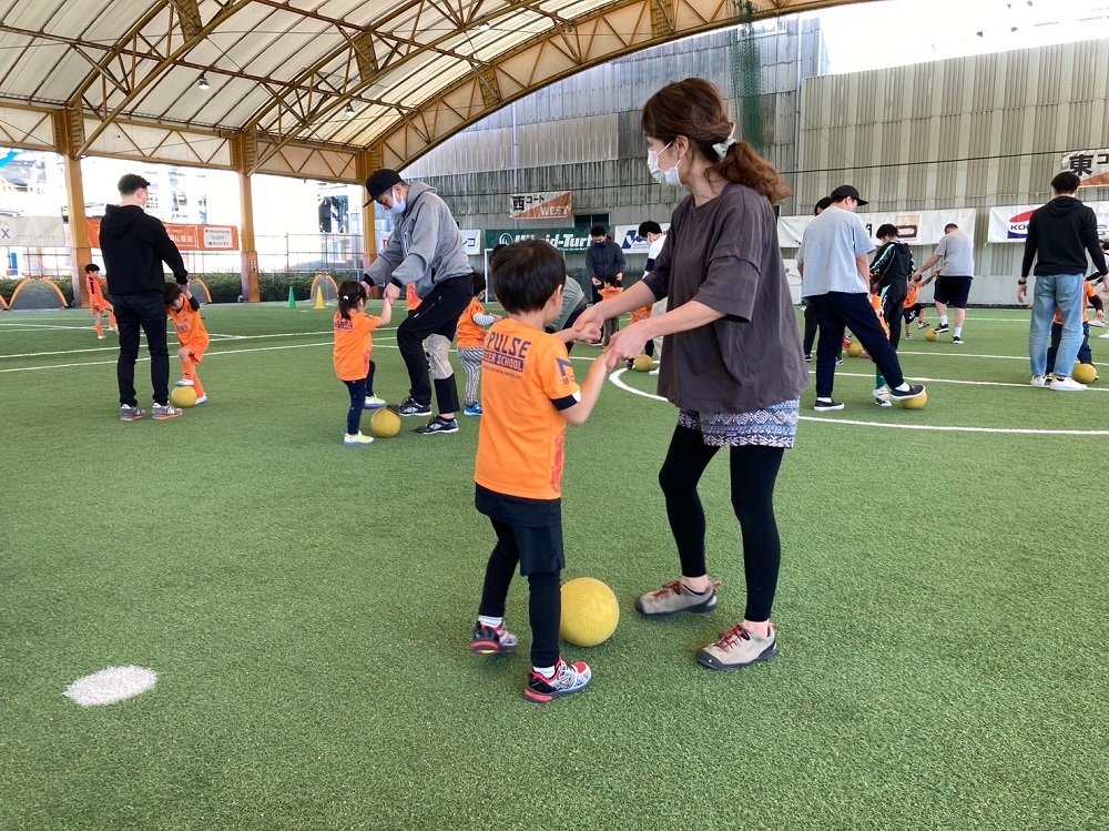 親子で行う体操や動きづくりに始まり、親子でキャッチボールや、足で扱うパス練習、カラーコーンを親子で協力しながら攻略し、ゴールを決めるシュートトレーニングなどを行い教室の最後には、ミニゲームを行い、終始笑顔あふれる教室となりました。