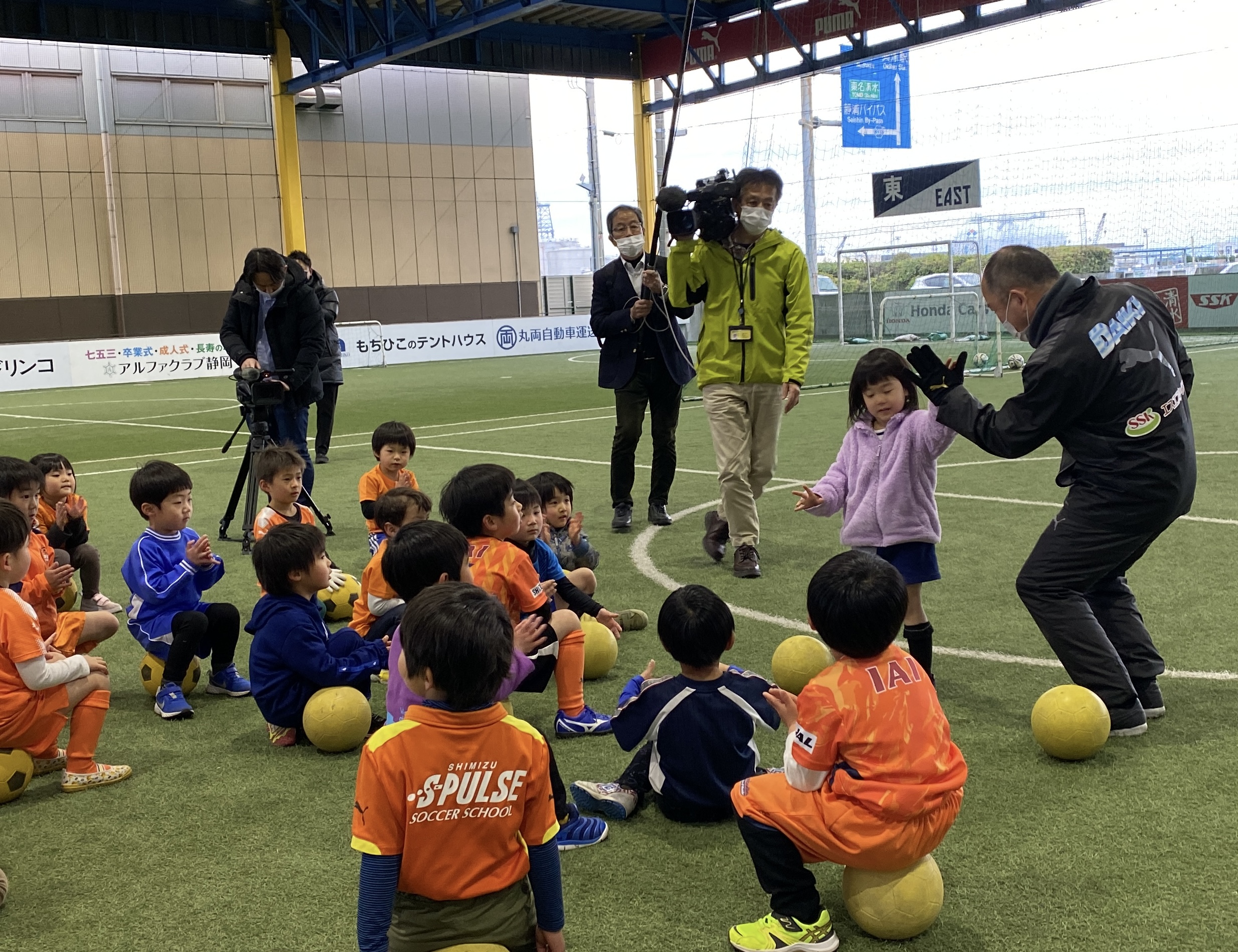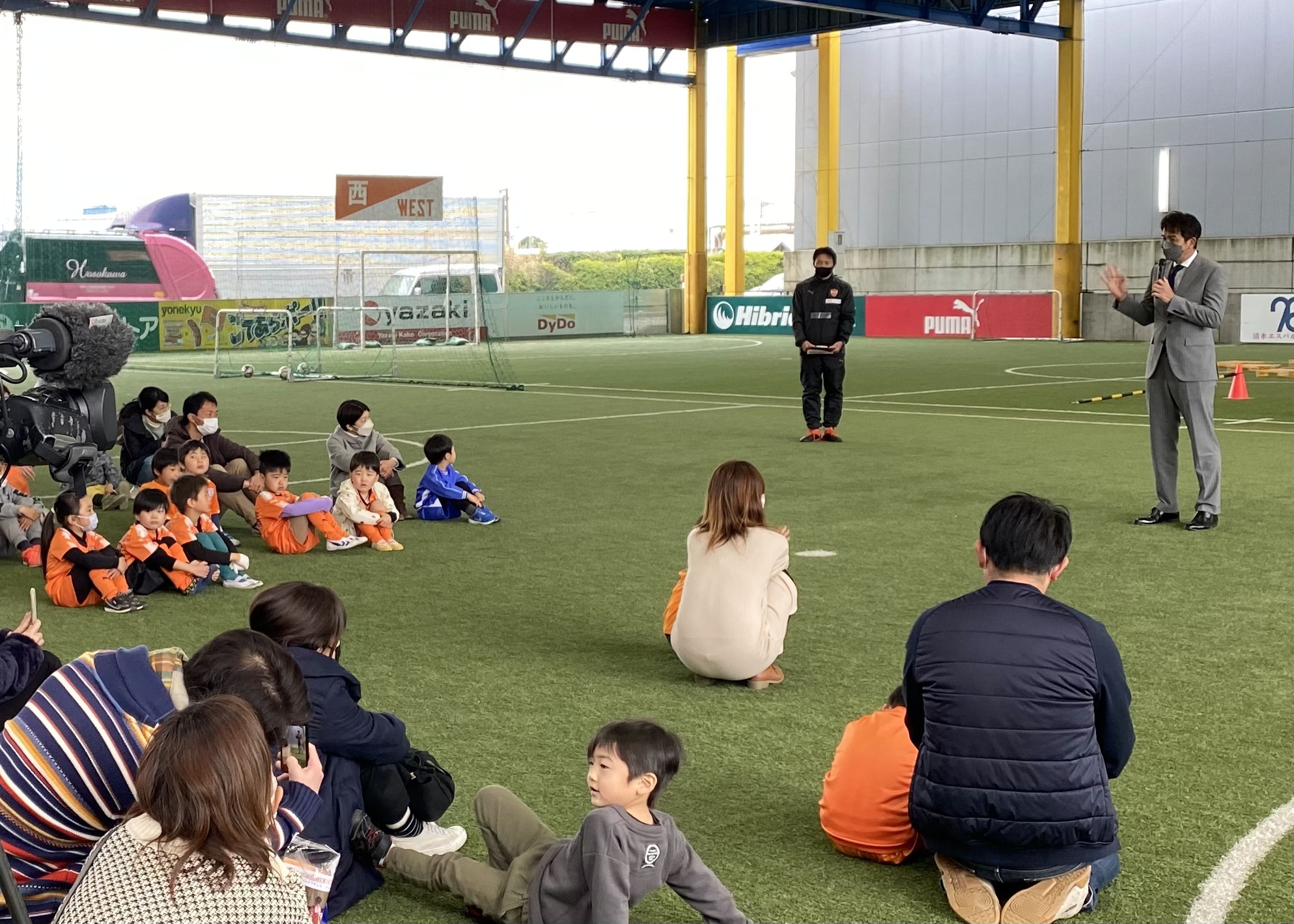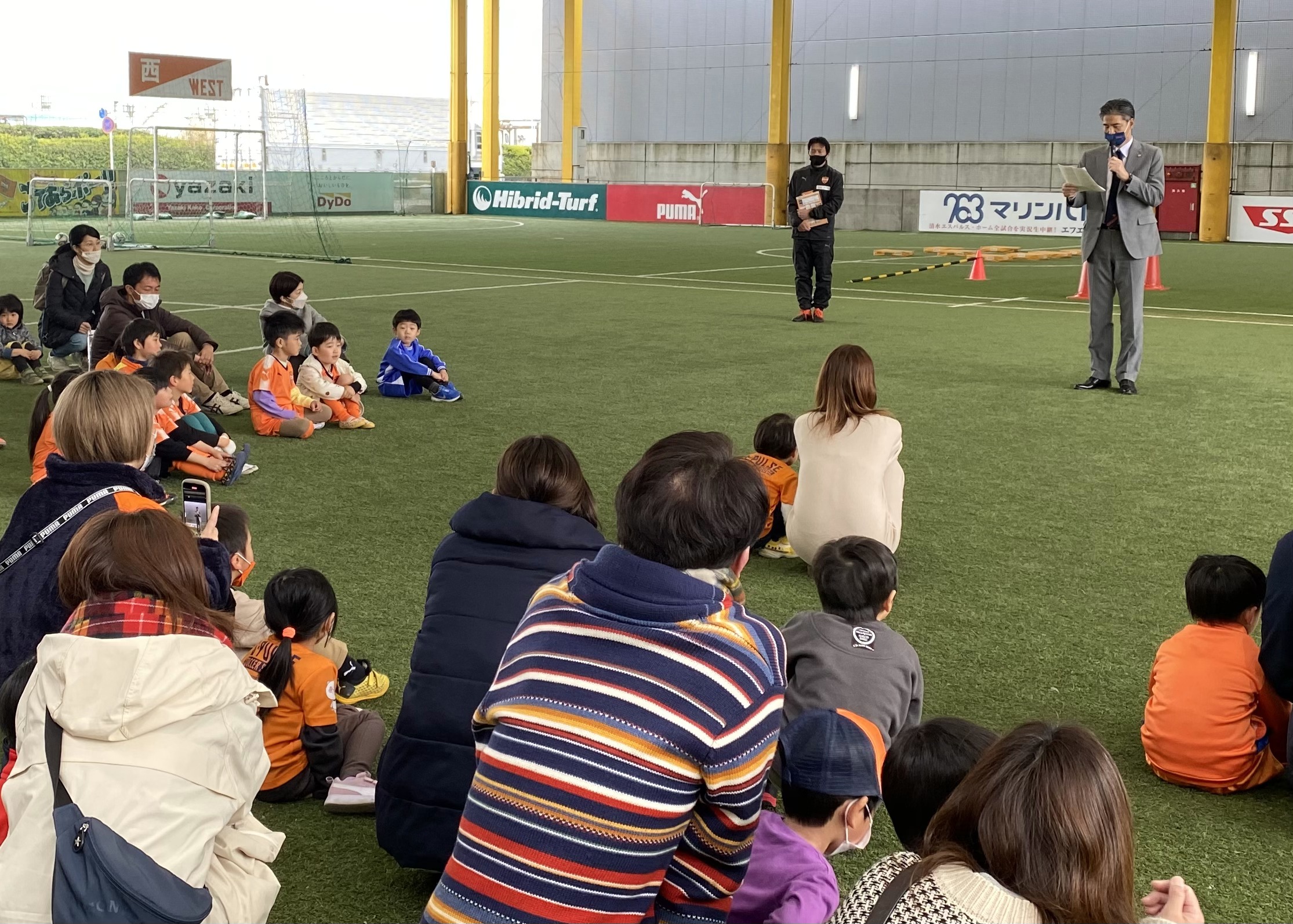 セレモニーでは ㈱エスパルス代表取締役社長 山室晋也より、小中高生の体力低下といった社会的背景に対して、エスパルスが様々角度から積極的に課題解決に取り組んでいくことを、クラブ・リレーションズ・オフィサーの大榎克己からは、サッカーとの出会いの大切さと幼少期からの運動習慣の大切さをお話しいただきました。