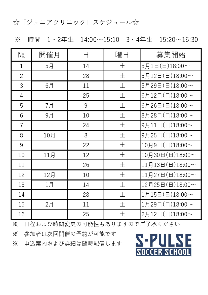 清水エスパルスは、5月14日(土)にエスパルスドリームフィールド藤枝にて、1年生から4年生を対象とした『第1回ジュニアクリニック』を開催いたします。