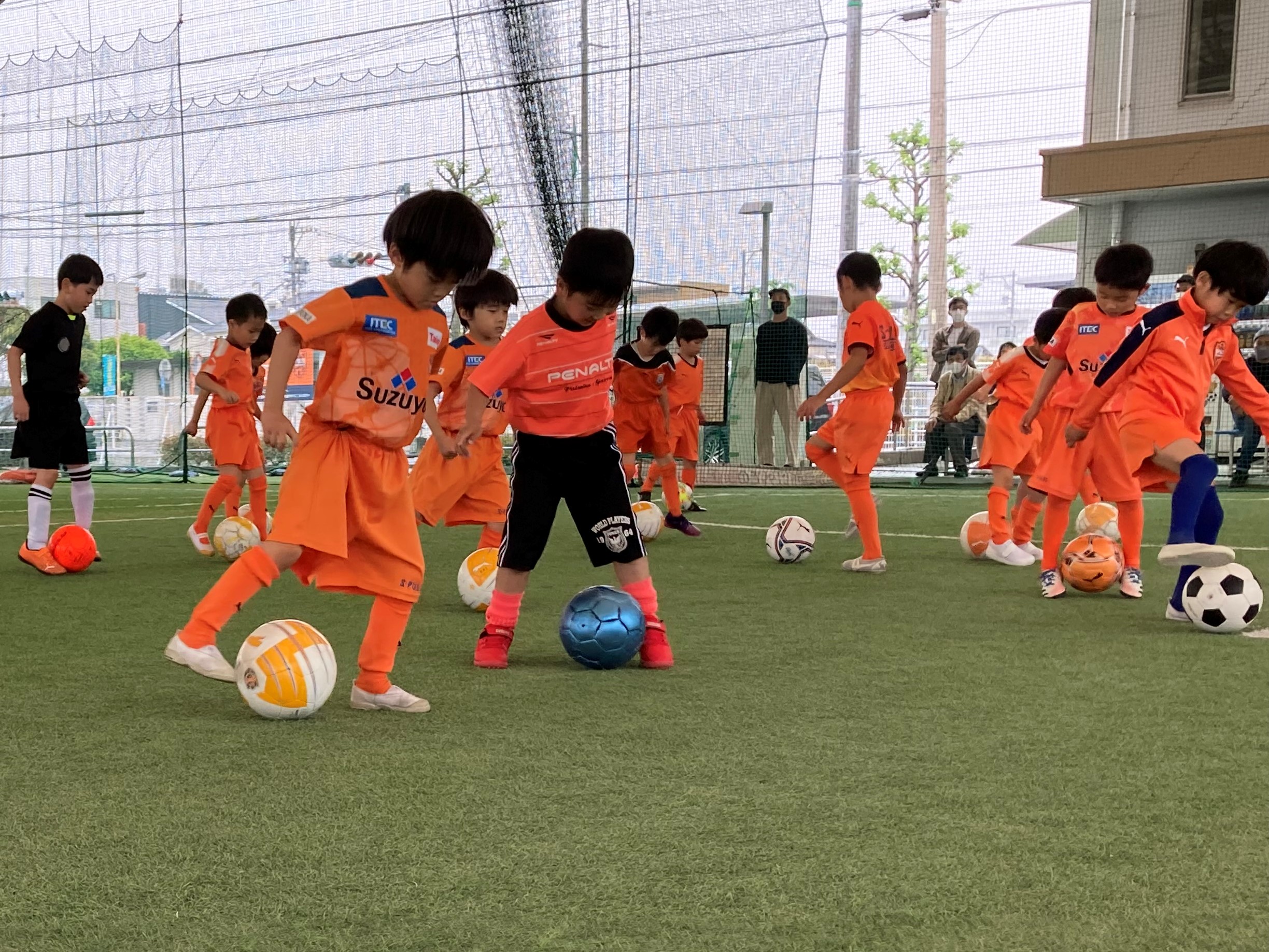 今回は1.2年生が「左右両足を使ってプレーしてみよう」、3.4年生が「相手を観てプレーしてみよう」というテーマ。ウォーミングアップではドリブル鬼ごっこで相手を観てプレーするところからスタートし、ボールの置き所や目線やカラダの使い方も考えながらプレーする練習を行いました。