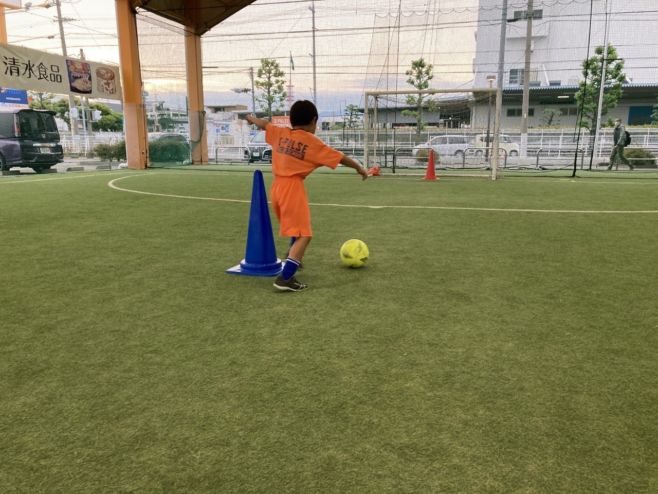 ボールフィーリングでは、最初にボールの当てる場所・自分の立ち位置・軸足の向きや位置といった基本を伝えました。