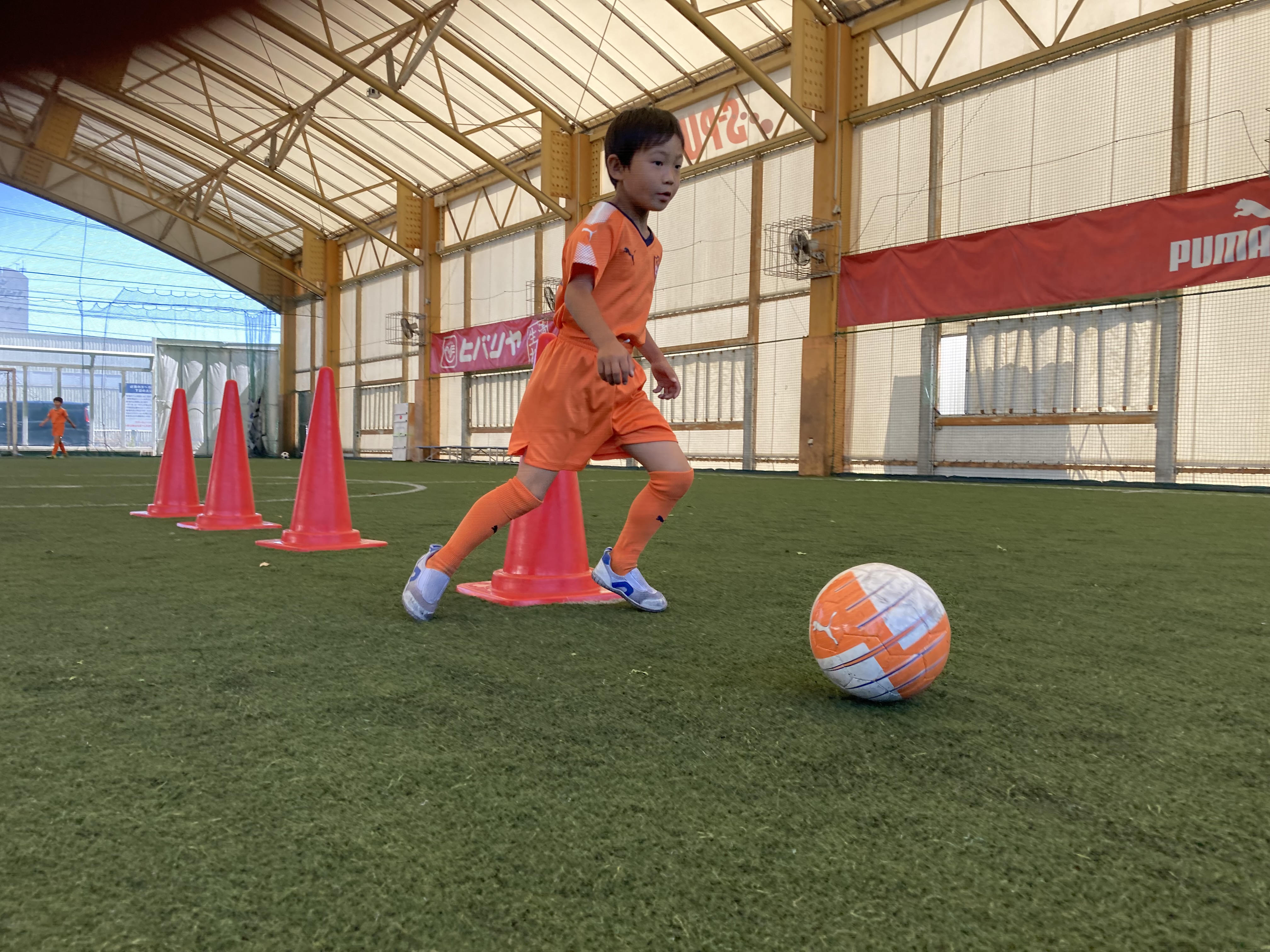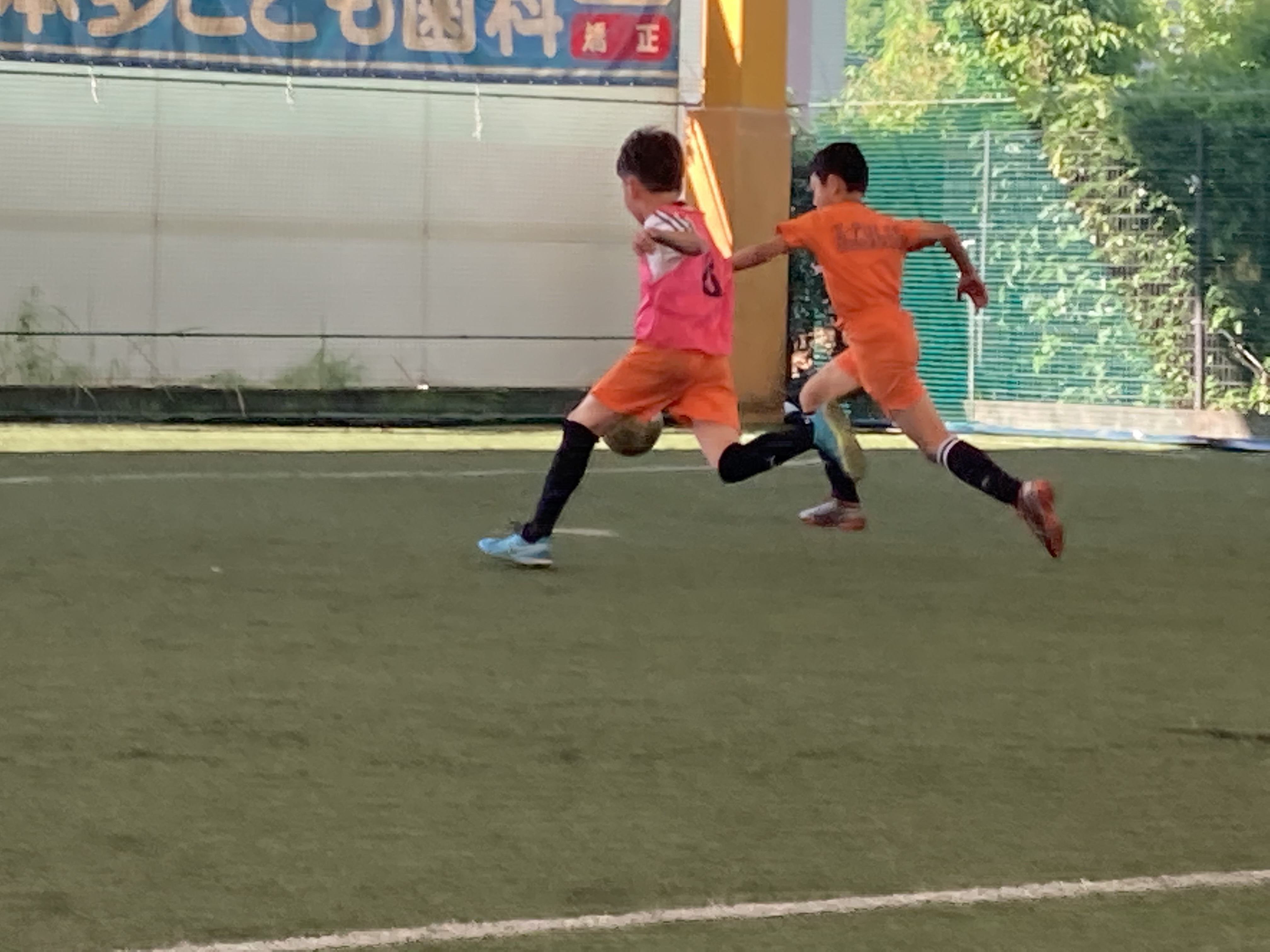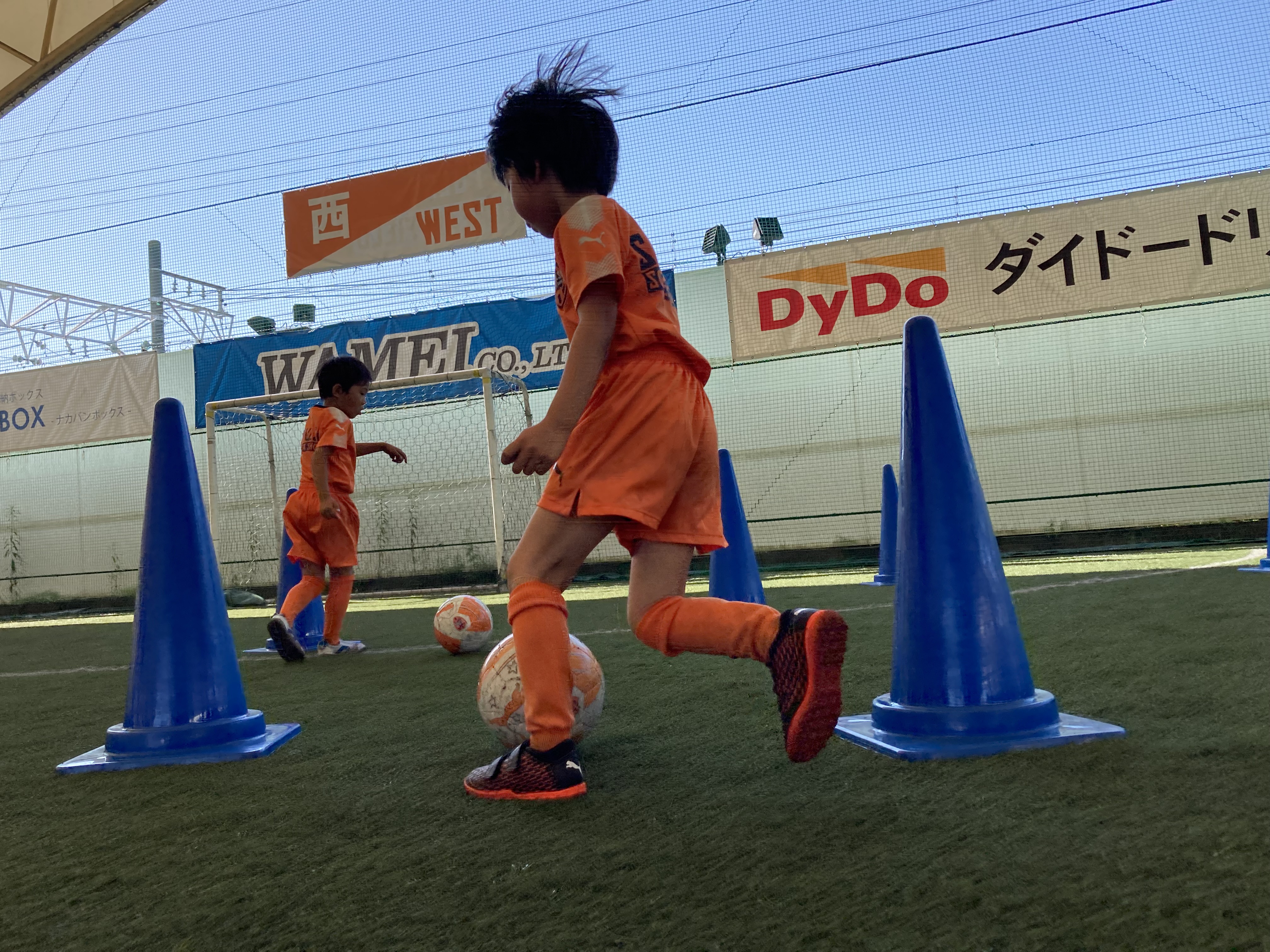 学年関係なくシュート練習を自分たちで始める様子。そして、兄弟で参加した選手たちは、コーンを並べ1対1を行っていました。