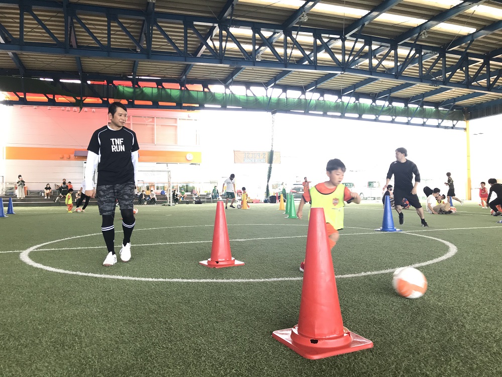 次は、親子で協力するメニューです。たくさんのコーンの間を親子でパス交換をする「コーン通し競争」や、コーンにボールを蹴って当てて、距離を伸ばしていく「コーン当て」を行いました。どうやったら速くできるか!どうやったらコーンに当てることができるか!親子で話し合いながらチャレンジしていました。