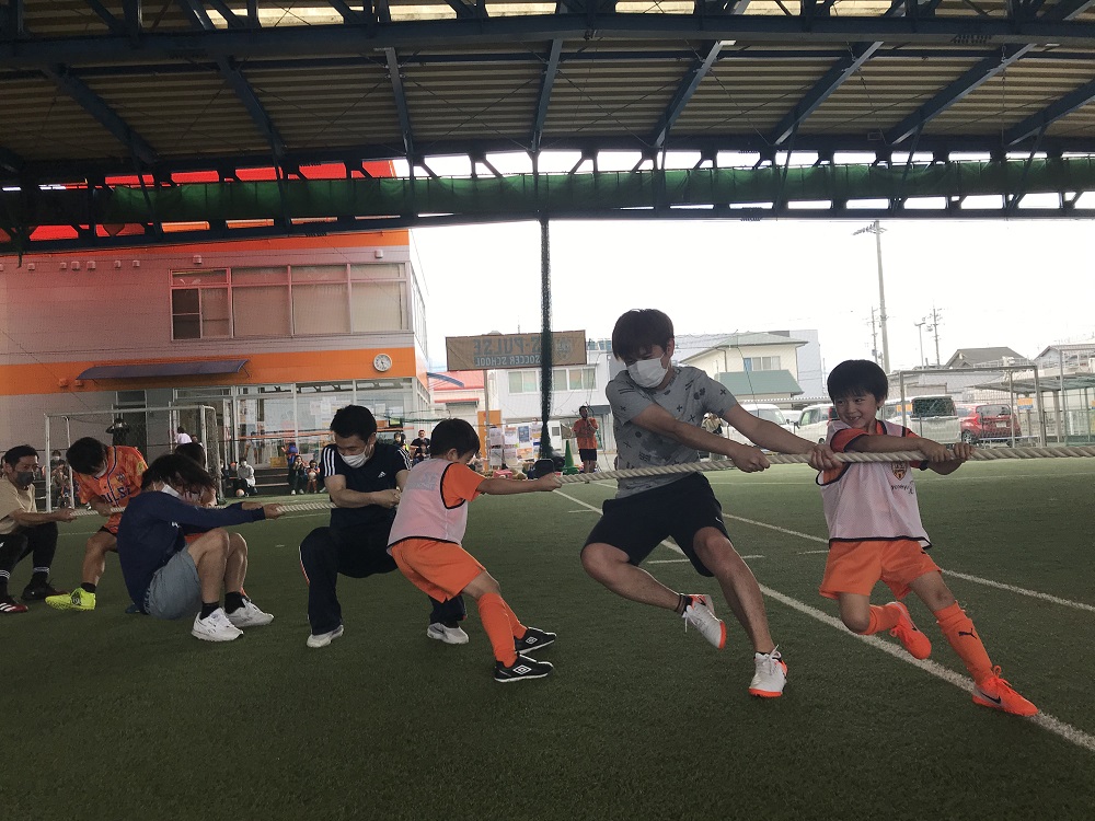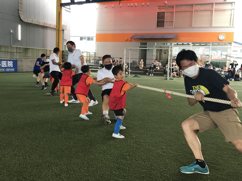 そして今回のスペシャル企画!「綱引き」です。4色のチームに分かれてトーナメント戦形式で行いました!「レディーゴー!!」の合図で、みんな一斉に綱を引き始めます!みんなが歯を食いしばって頑張る姿に、観ている他のチームやお母さんからも声援が送られていました!お父さんが一生懸命頑張る姿に、スクール生たちも負けじといっぱい綱を引いていました。