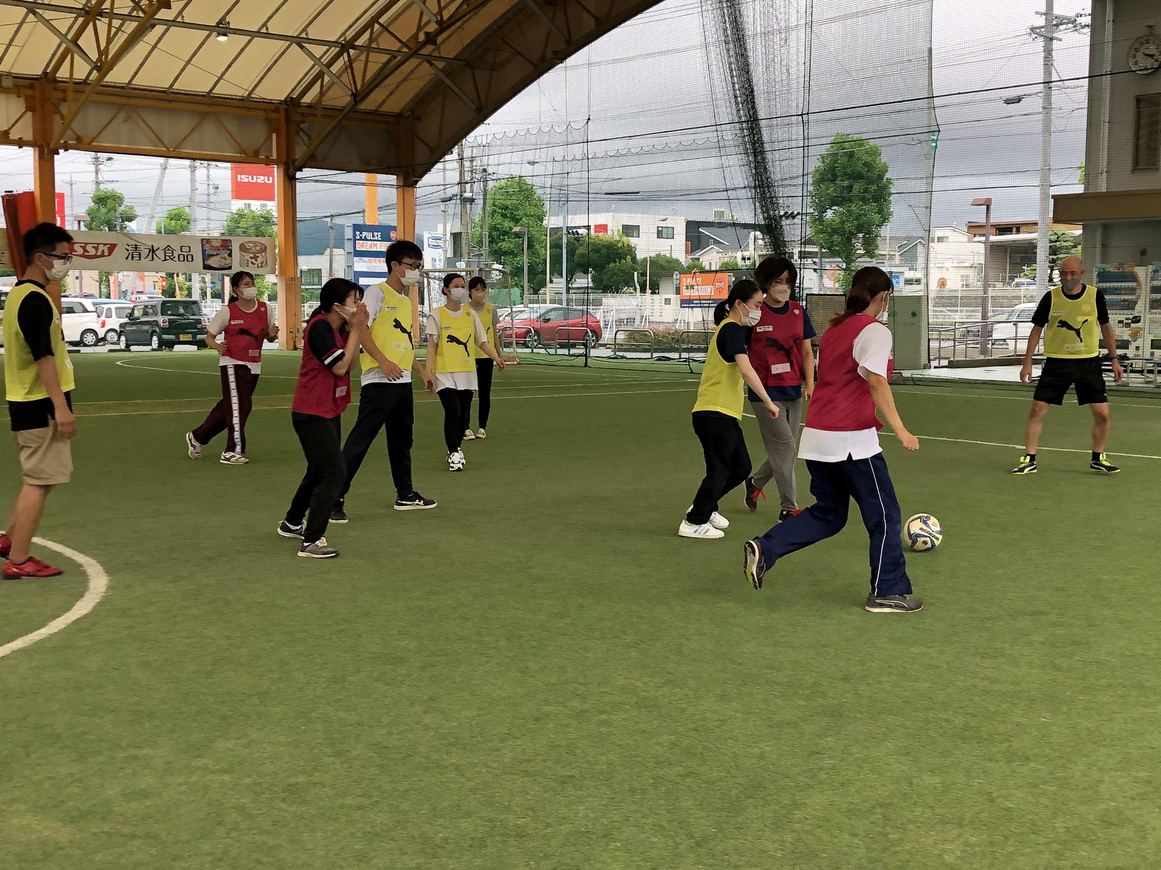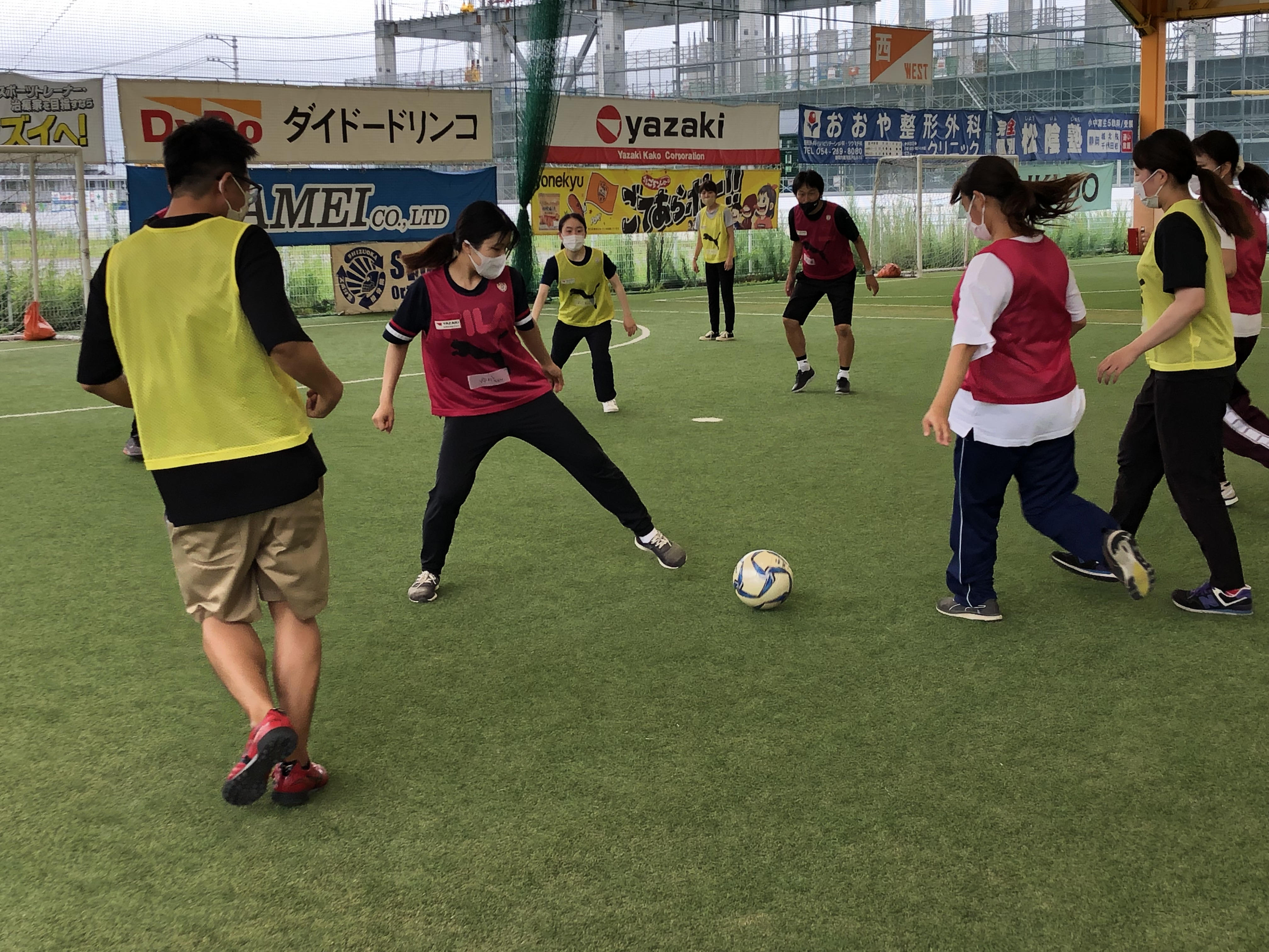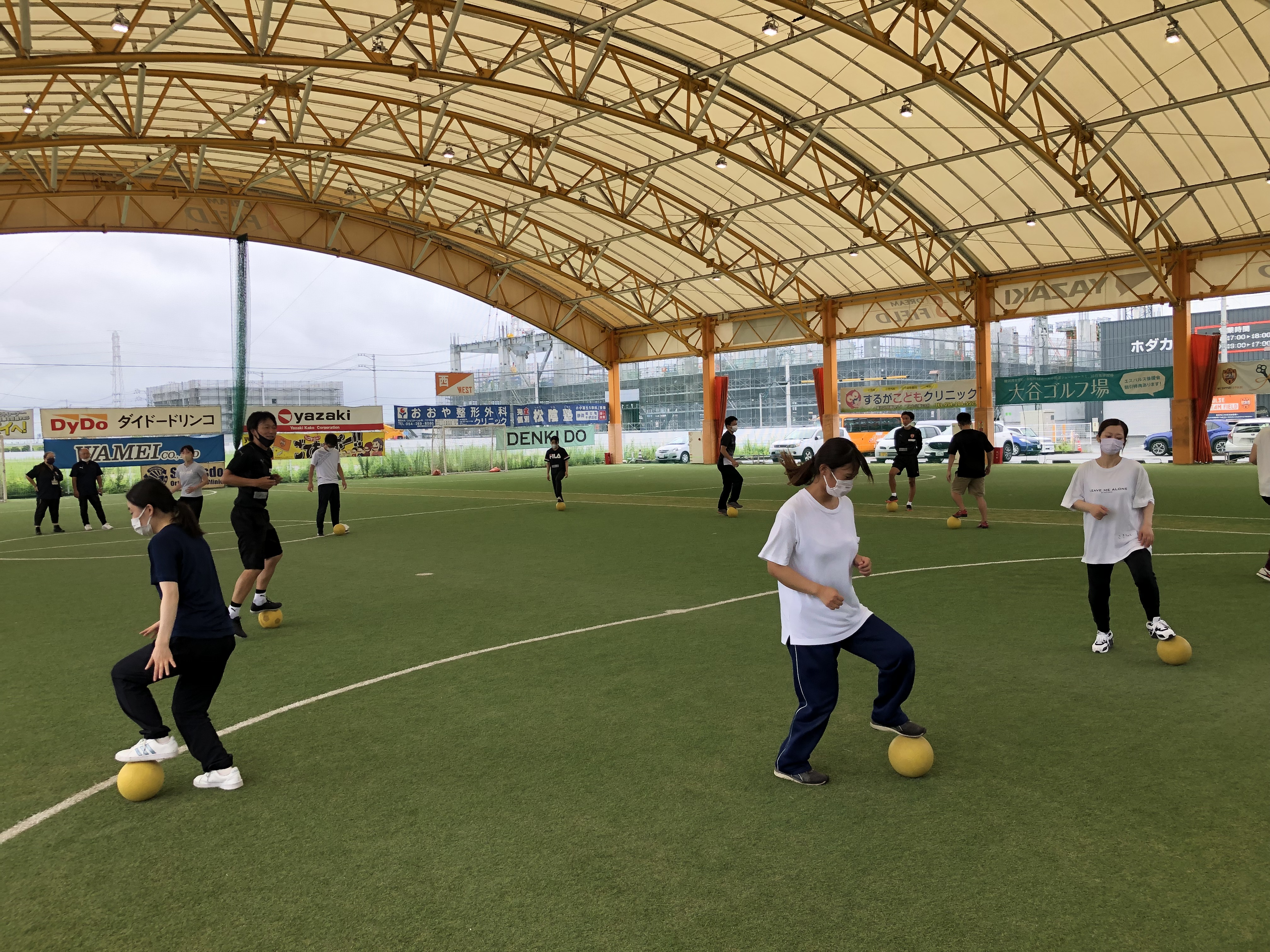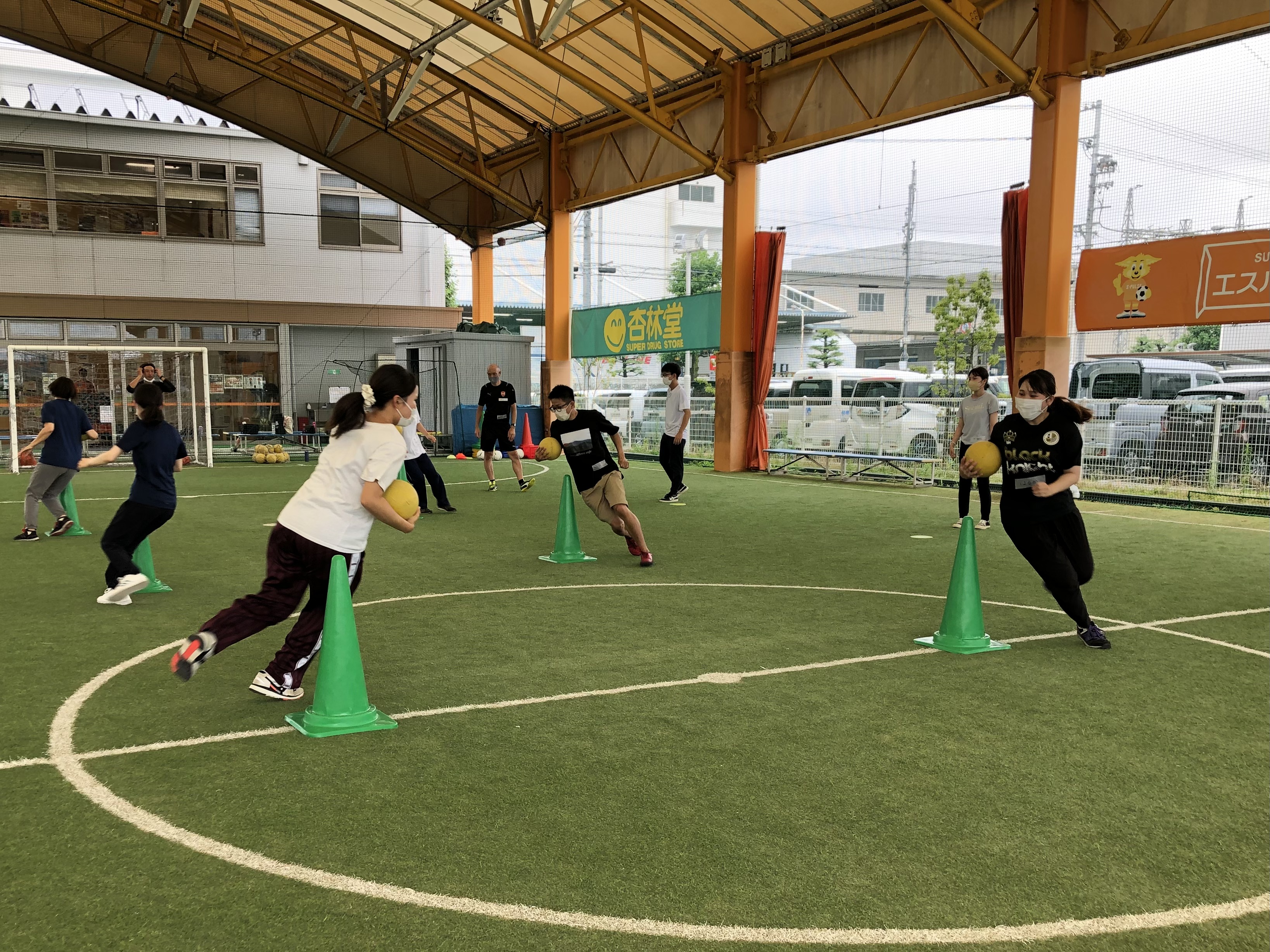実技の内容は、「鬼ごっこ系」、「動きづくり系」、「ボールフィーリング系」、「ゲーム」と普段サッカースクールで幼児クラス(キッズクラス)の子どもたちが行っているメニューを参加していただいた先生方に実際に経験していただきました。