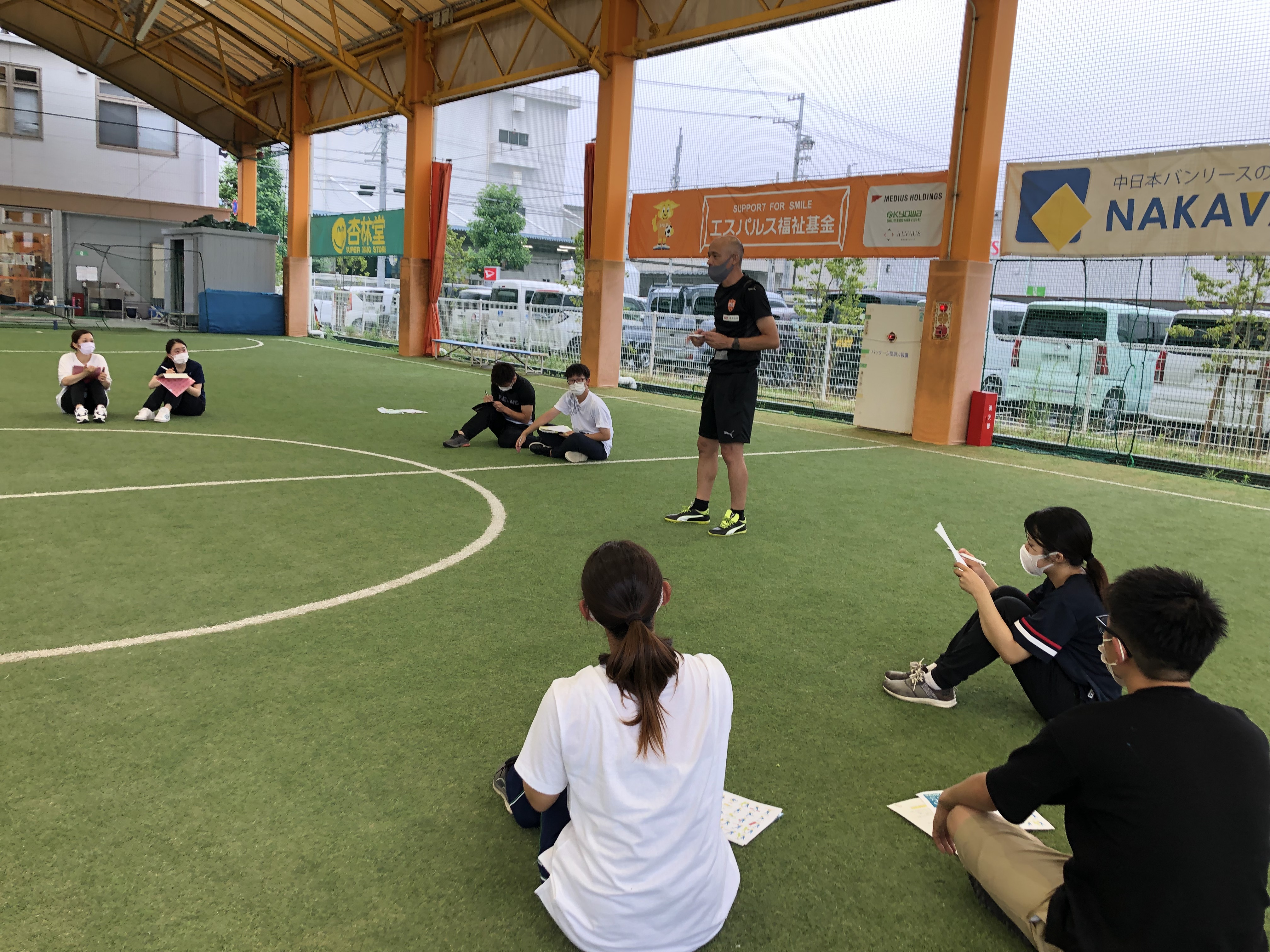 例年は、室内にて映像を交えながらの講義1時間、ピッチでの実技1時間という形式で行っておりましたが、コロナ禍の影響を考慮した形としてピッチ上で1時間の実技、その後そのままピッチ上で資料を基に座談会形式の講義を行いました。