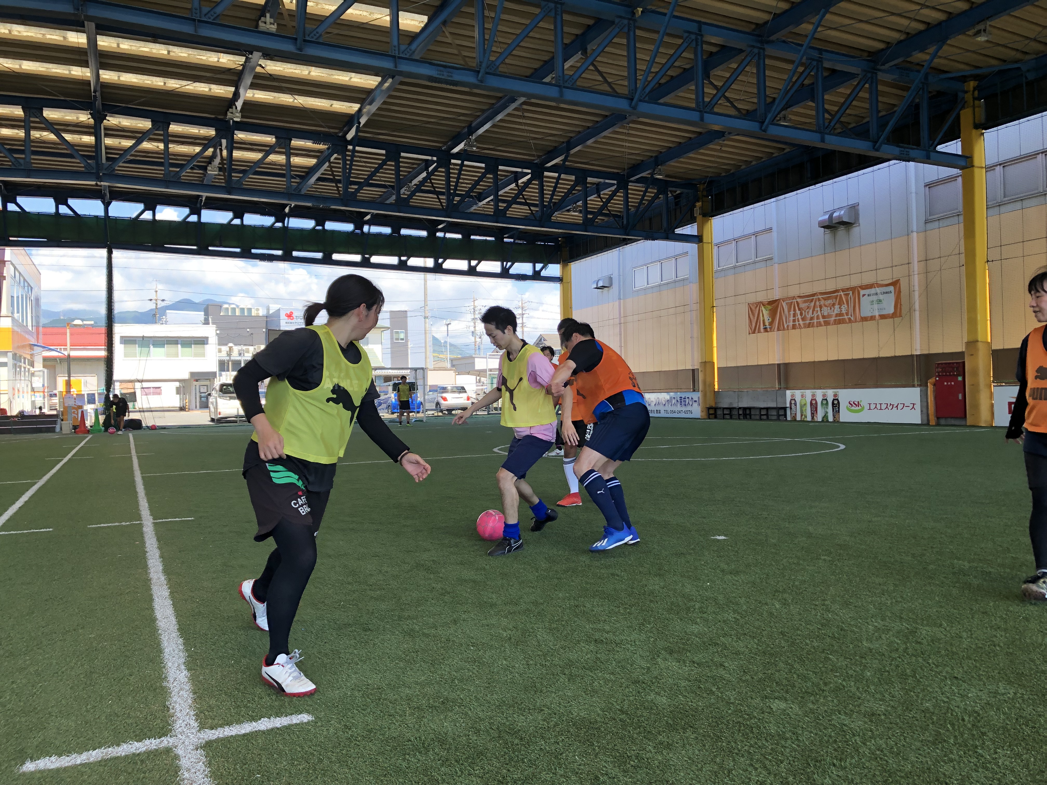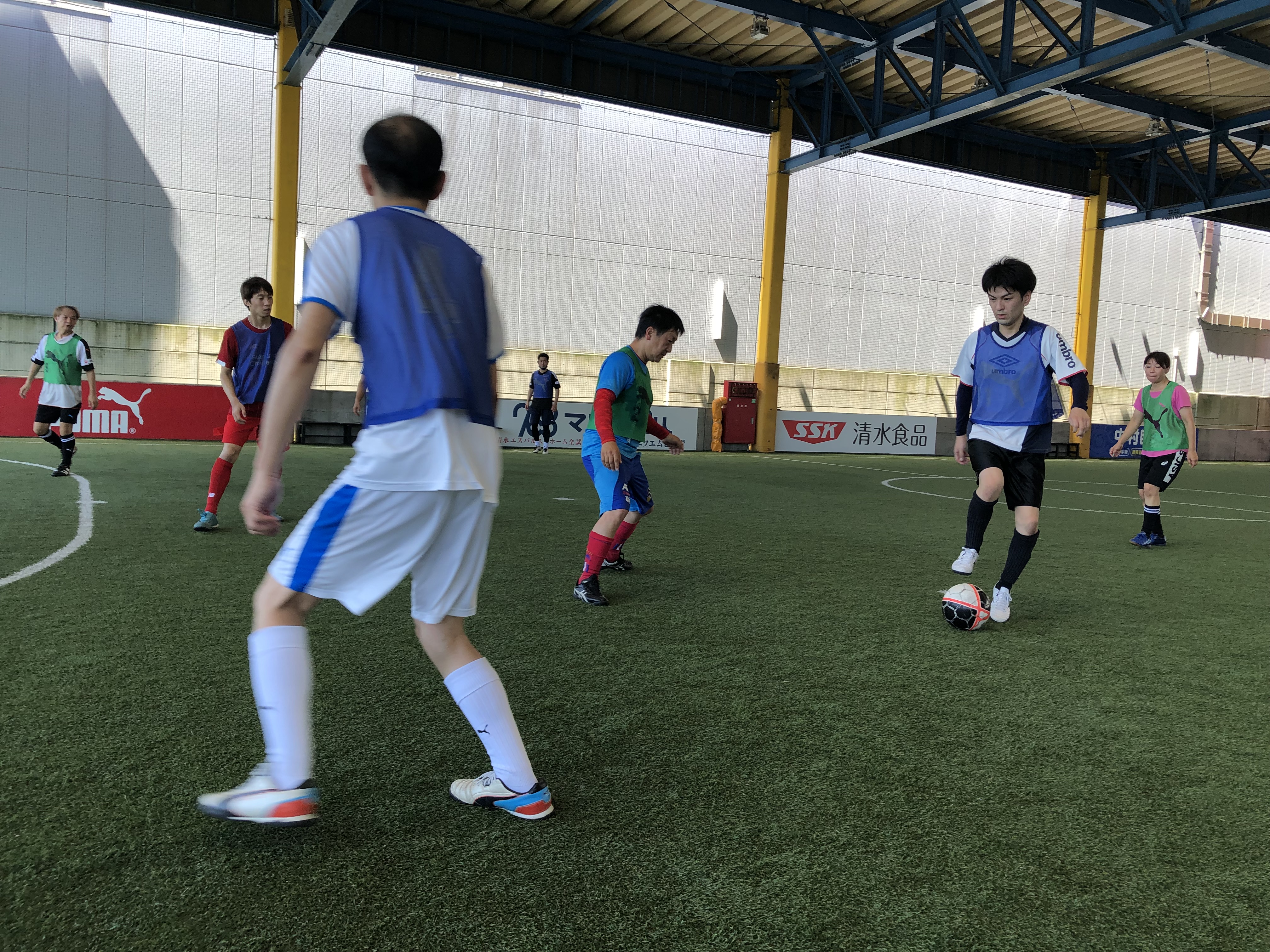 次に、2分の1コートでの3対3のミニゲームを行いました。全部で4コートに分かれて行われる3対3。それぞれのコートが順番にJ1、J2、J3、JFLとランク付けされています。勝ったチームは昇格、負けると降格、といったルールで行うことで、ピッチ上は大盛り上がりです!ゴールのたびに「よっしゃー!!」、「よーっし!」、「うわぁああっ!」などの声が飛び交い、楽しさが溢れているようでした。