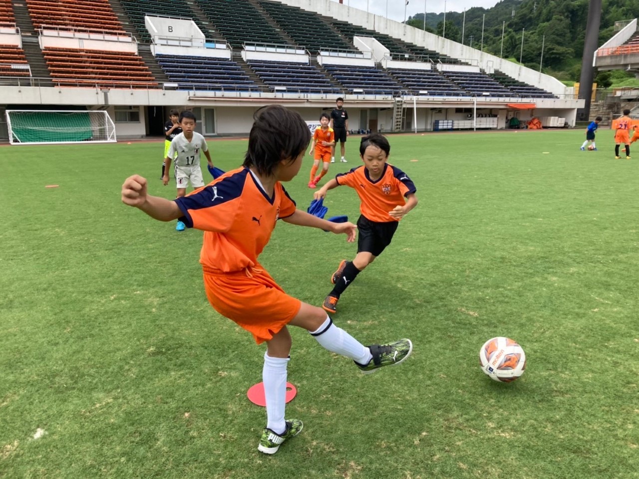 子どもたちがピッチに入ると、「芝生キレイ!」や「観客席までこんなに近いんだ!」など、高学年でしたが素直に興奮し感じたことを言葉にする選手が多く、我々コーチ陣も嬉しく思いました。目標設定では、昨日のトレーニングをふまえて、苦手な部分にチャレンジする選手やどうやったら目標を達成するか考えている選手が見られました。