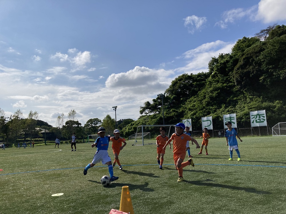 はじめのうちは、どうしても足元に入れてしまい周りを観られなくなることが多かった選手たちですが、ドリブルしながらスペースを探すことやファーストタッチを動かすことをトレーニングしていくと2対2やゲームの中で、自然と体の向きを考えてポジションを取ったり、相手の様子を観てファーストタッチを動かしてシュートまでたどり着いたりとだいぶ変化していきました。