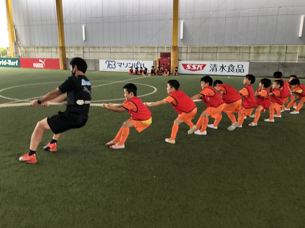 なんと、綱を引いた先にはボールがあり、シュートをしてミニゴールに決めないと勝ちにはなりません!初めて綱引きをするスクール生も多くちょっと緊張気味??
