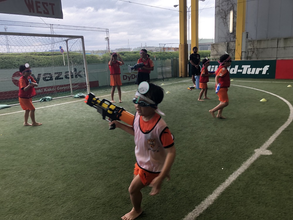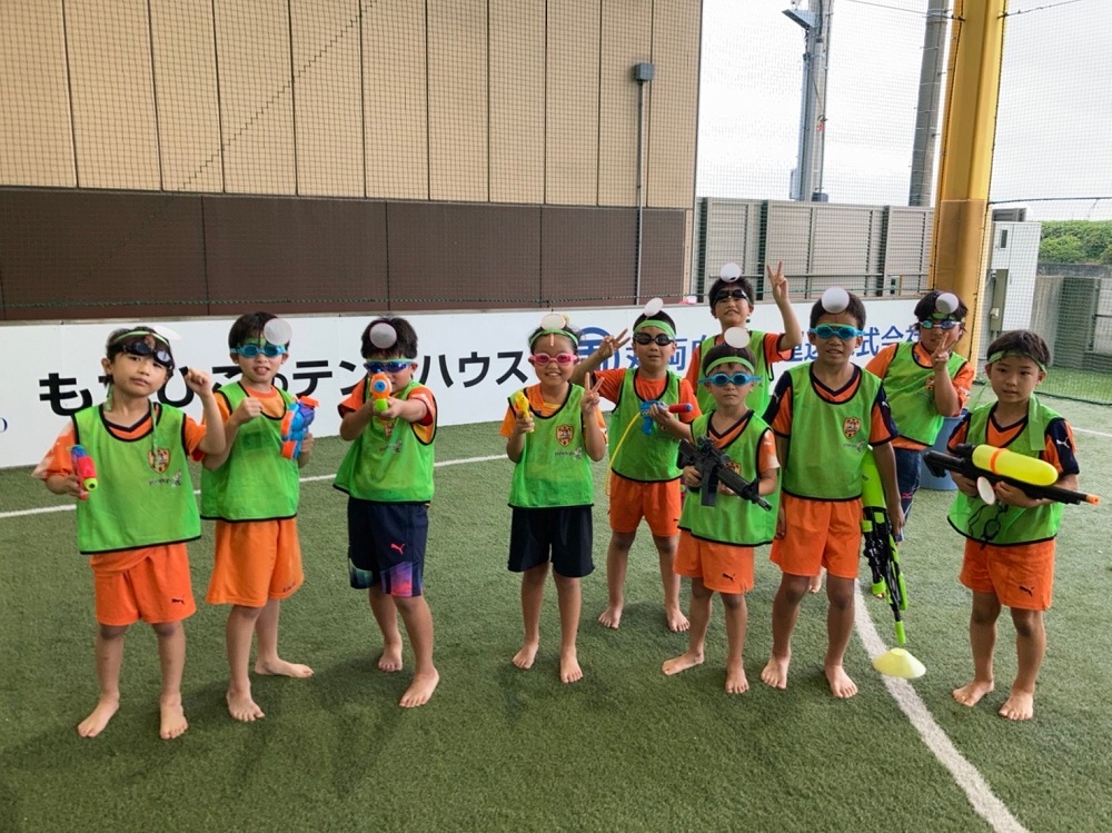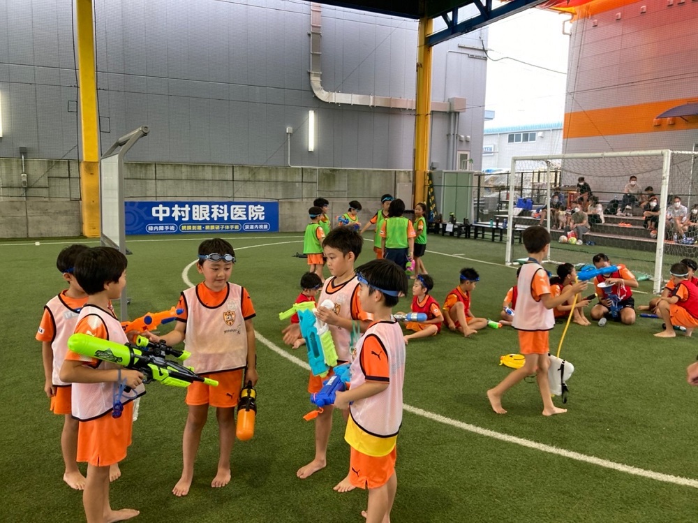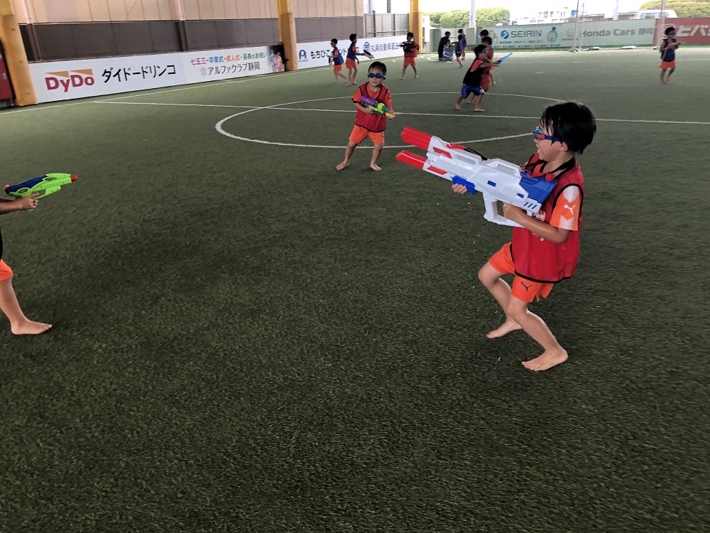 この日は清水エリアの夏のお楽しみイベント!サッカーの試合!綱引き!水鉄砲対決!と内容盛り沢山!当日を心待ちにしていたスクール生が多く!みんな笑顔でドリームフィールド清水に集まりました!今回の水鉄砲対決は、自分の水鉄砲を持ち込みOK!見たこともない大きな水鉄砲を持って気合十分の様子!まずは、ウォーミングアップの後はサッカーの試合から始まりました!