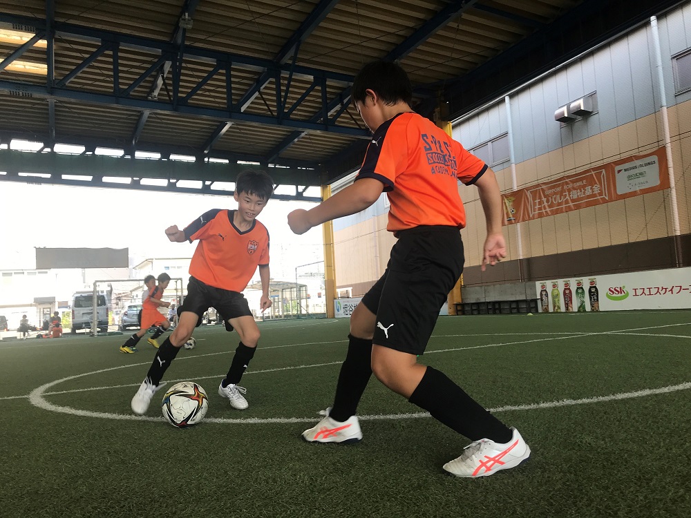 次のトレーニングでは、攻撃方向のない1対1のトレーニングを行いました。最初に行ったドリブルトレーニングの意識があり、初めからボールの置きどころや軸足を意識する選手が多く、高いレベルでトレーニングを行うことが出来ました。また、身長が大きくない選手が大きい相手に奪われない為にどのようなことが必要かを伝えることで、良いプレーが多く出ていました。