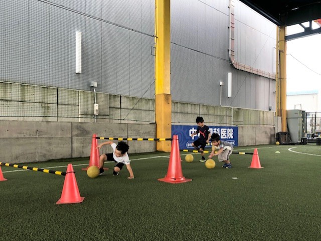 始まってみると、子どもたちは元気いっぱいでした!動きづくりのサーキットトレーニングからスタートして、手でボールを扱うコーディネーショントレーニング、そして先ほどのサーキットをドリブルやボールフィーリングを交えたスタイルでのチャレンジ!次々と繰り出される課題を楽しそうにクリアしていました。