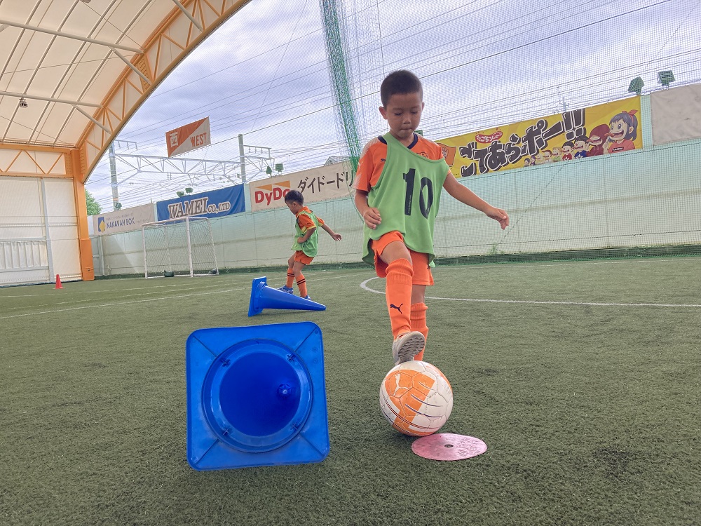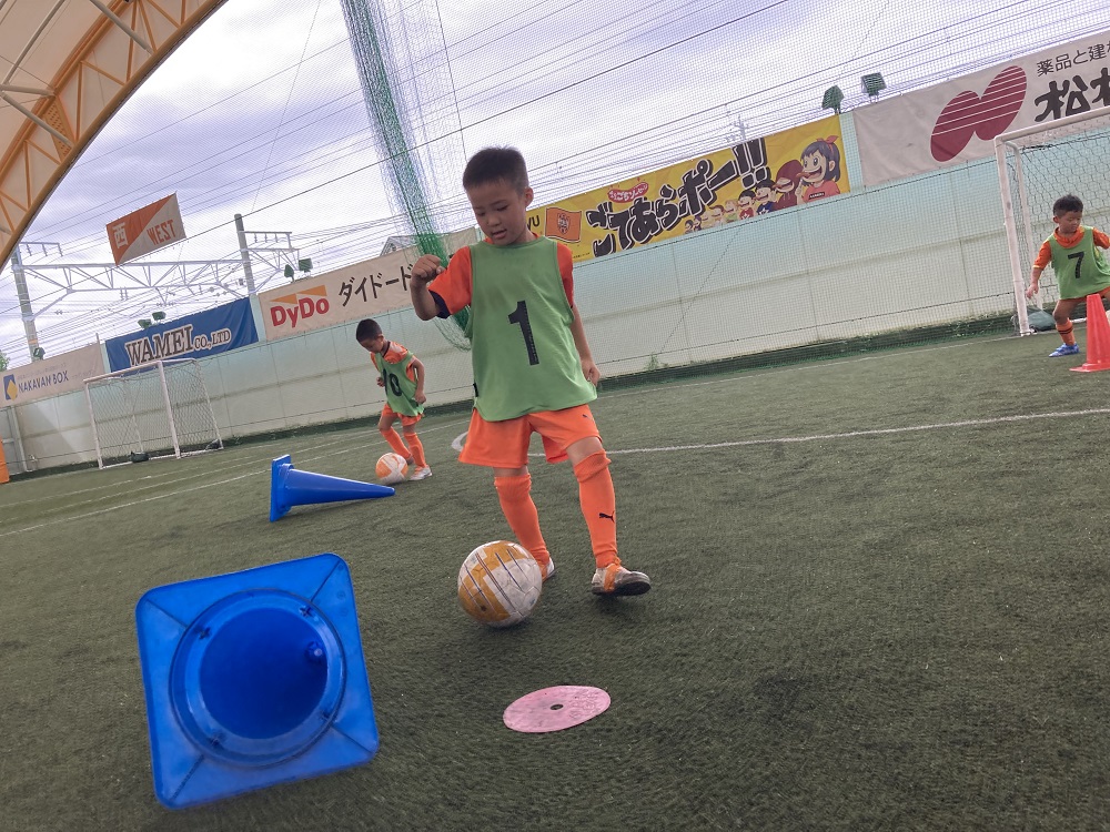 簡単にボールを奪われないように、コーンを相手と想定しターンの方向やフェイントするタイミング考えながらプレーしていました。