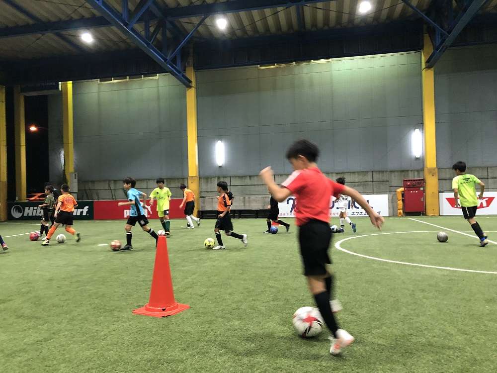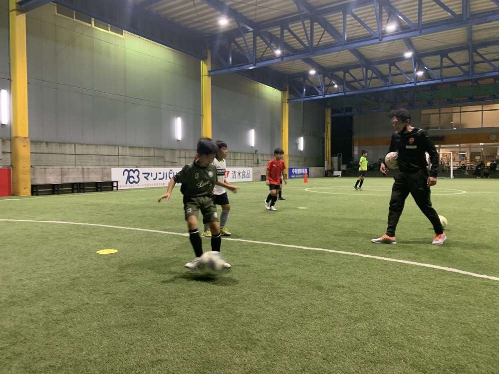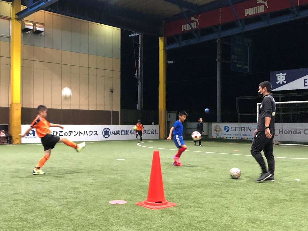 ウォーミングアップでは姿勢を意識したドリブル、浮き球のコントロール、手を使ってのコーディネーションと進みました。その後は2人組でのパス交換でインサイドキックの基本の確認です。