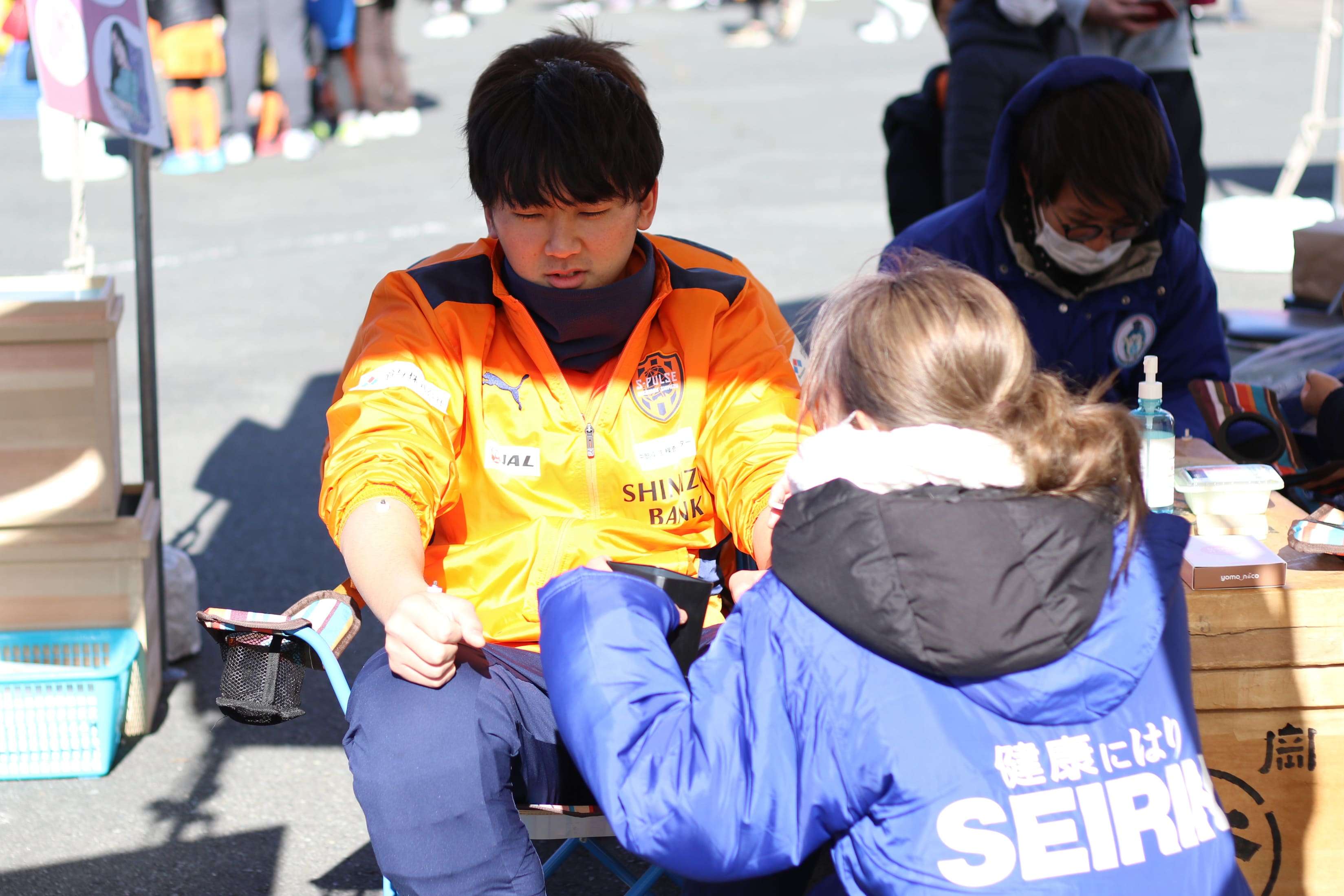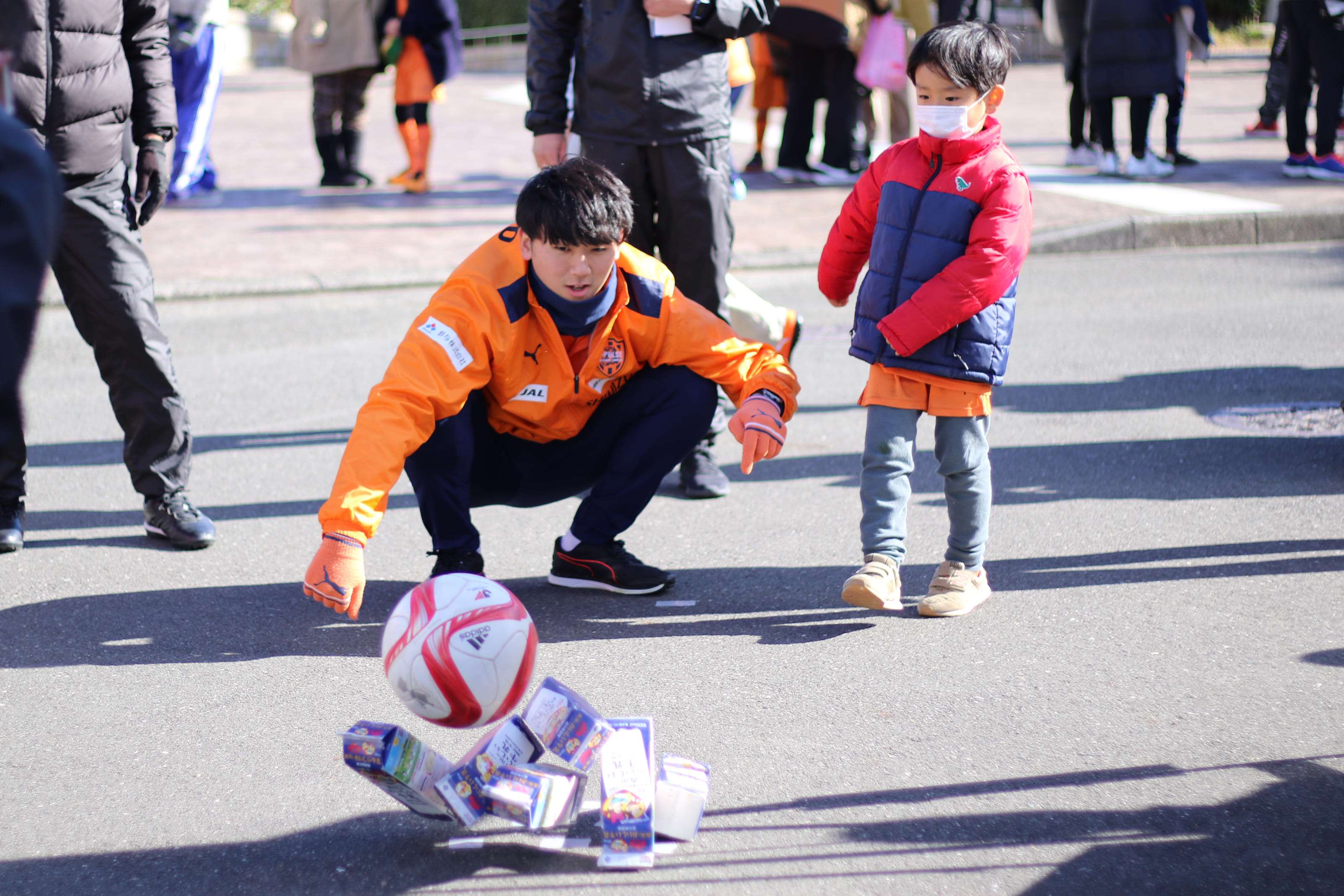 また、午前の部には、トップチームから、西澤健太選手と梅田透吾選手が参加し、子どもチームで一緒にプレーを楽しんだり、大人チームで子どもたちからボールを蹴り去ったり、プロの技を存分に見せつけました。