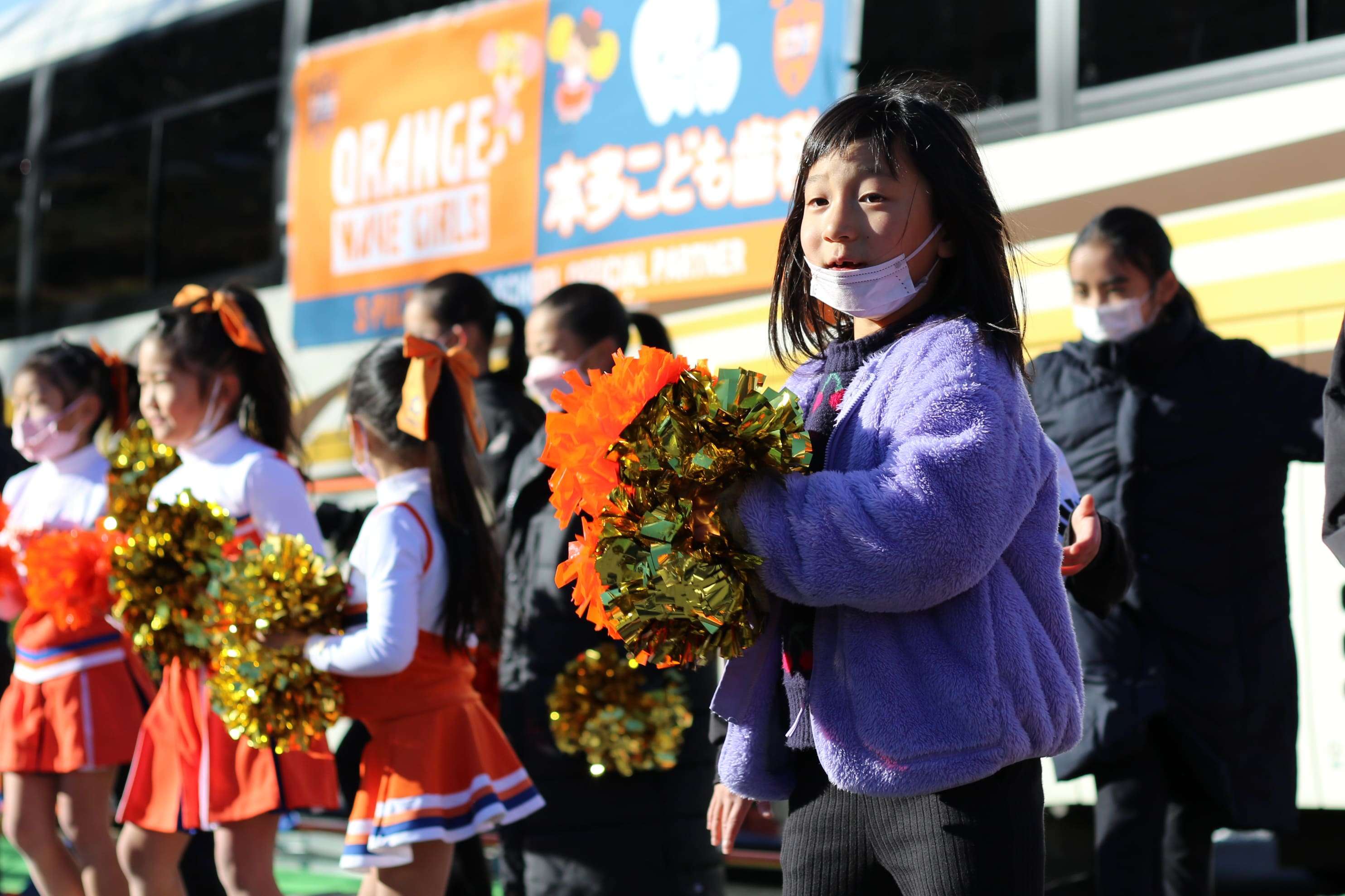 フリーダンスパフォーマンスでは、エスパルスダンススクール生はもちろん、まだダンススクールに通っていないお友達にも参加いただきました。一人ひとりに選抜クラスYOUTHからのメッセージカードもお渡しし、ダンスを通してたくさんの笑顔に出会うことができました。最後には、YOUTHと講師陣からオレンジウェーブの定番曲『レッツゴー!』をプレゼントし、フリーダンスパフォーマンスは終了いたしました。
