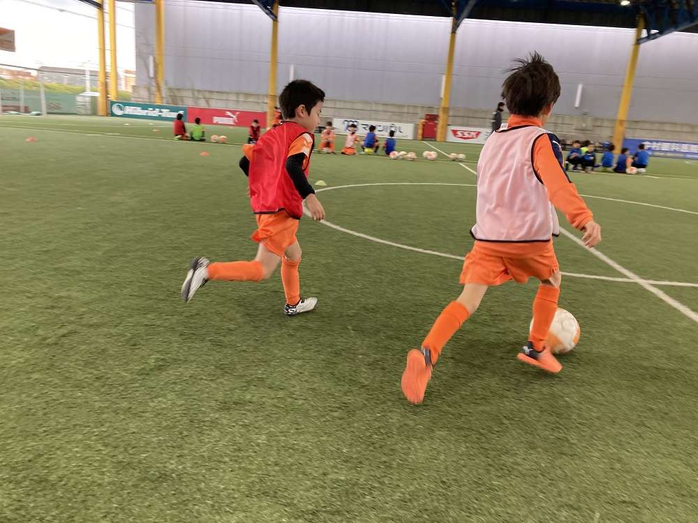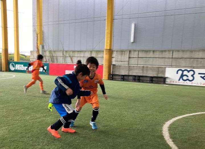 前回同様にウォーミングアップでは、2人組1組でしっぽとりを引き続き行いました。前回のテクニックスクールに参加している子も多く今回は身体を使ってフェイントをすることで相手の逆をとる動きが多くなりました。