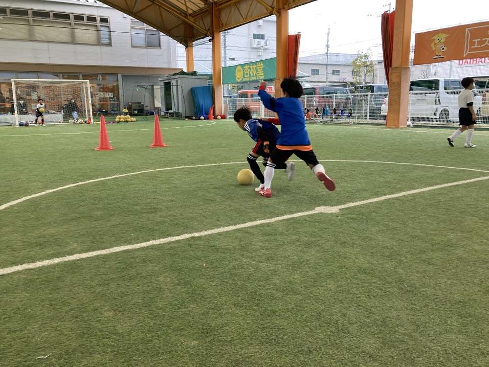 今回、1.2年生は「顔を上げてゴールを目指そう」、3.4年生は「相手を観てプレーを決めよう」というテーマで、最初は1対1のボールキープや様々なボールタッチを中心にしたW-upからスタートしていきました。