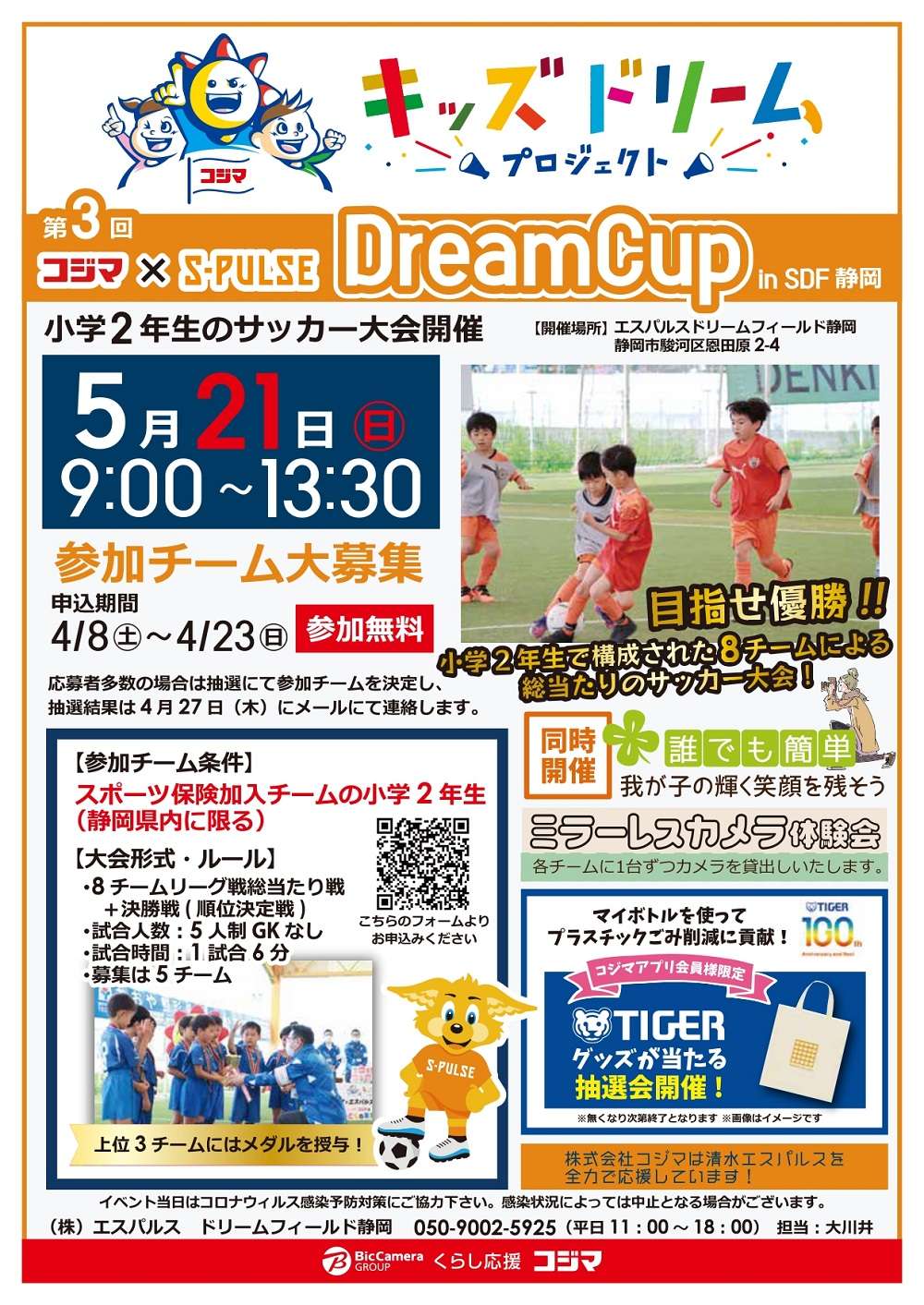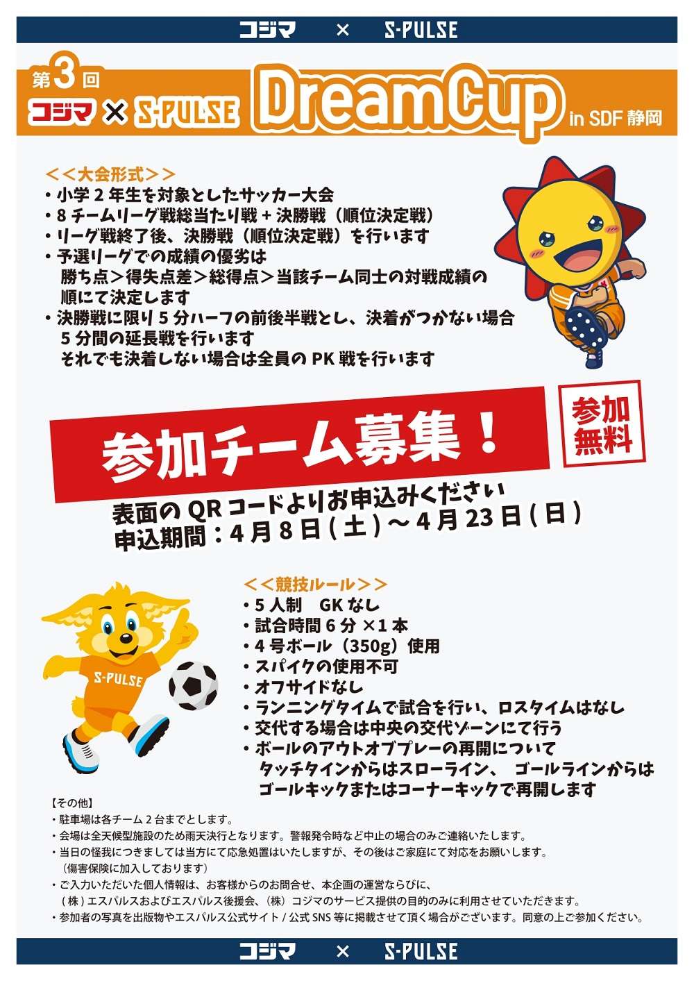 清水エスパルスは、クラブパートナーである株式会社コジマ様ご協力のもと、5月21日(日)にエスパルスドリームフィールド静岡にて、小学2年生を対象とした『第3回コジマ×エスパルス Dream CUP in SDF静岡』を開催いたします。