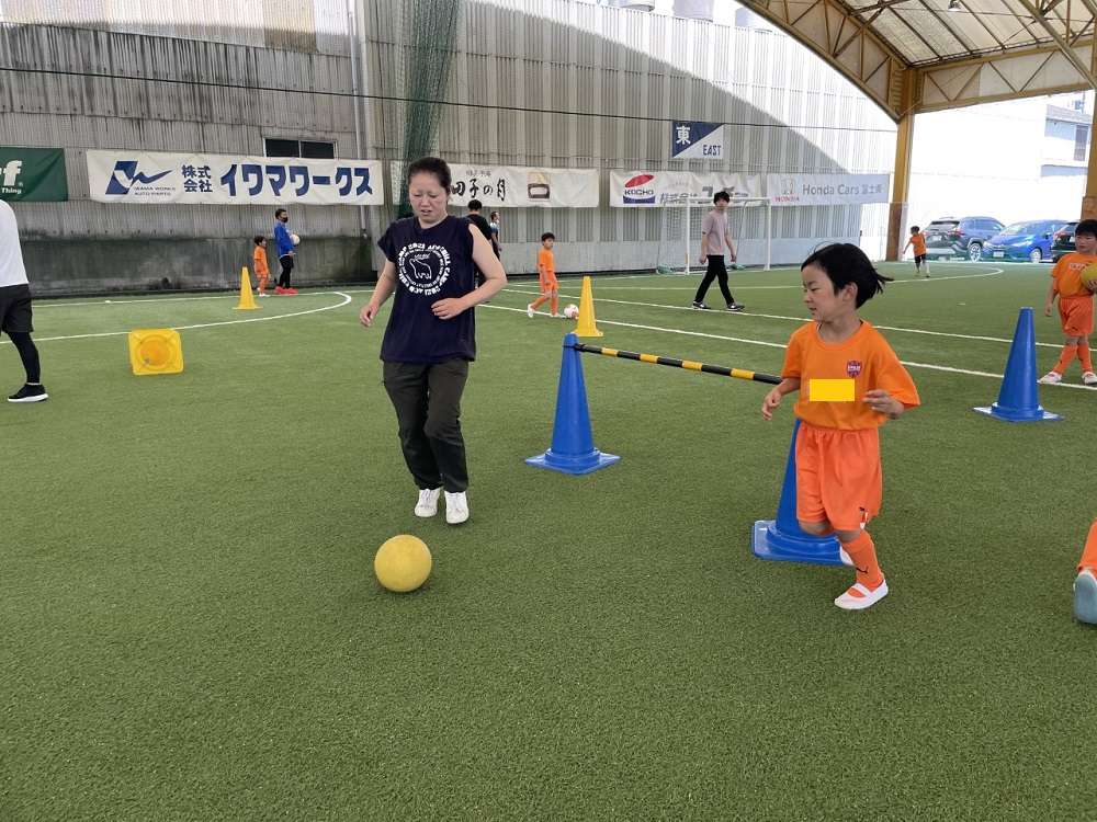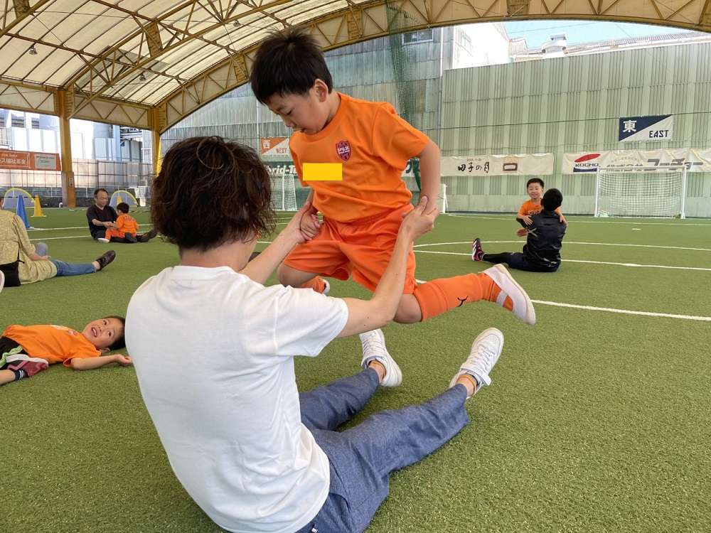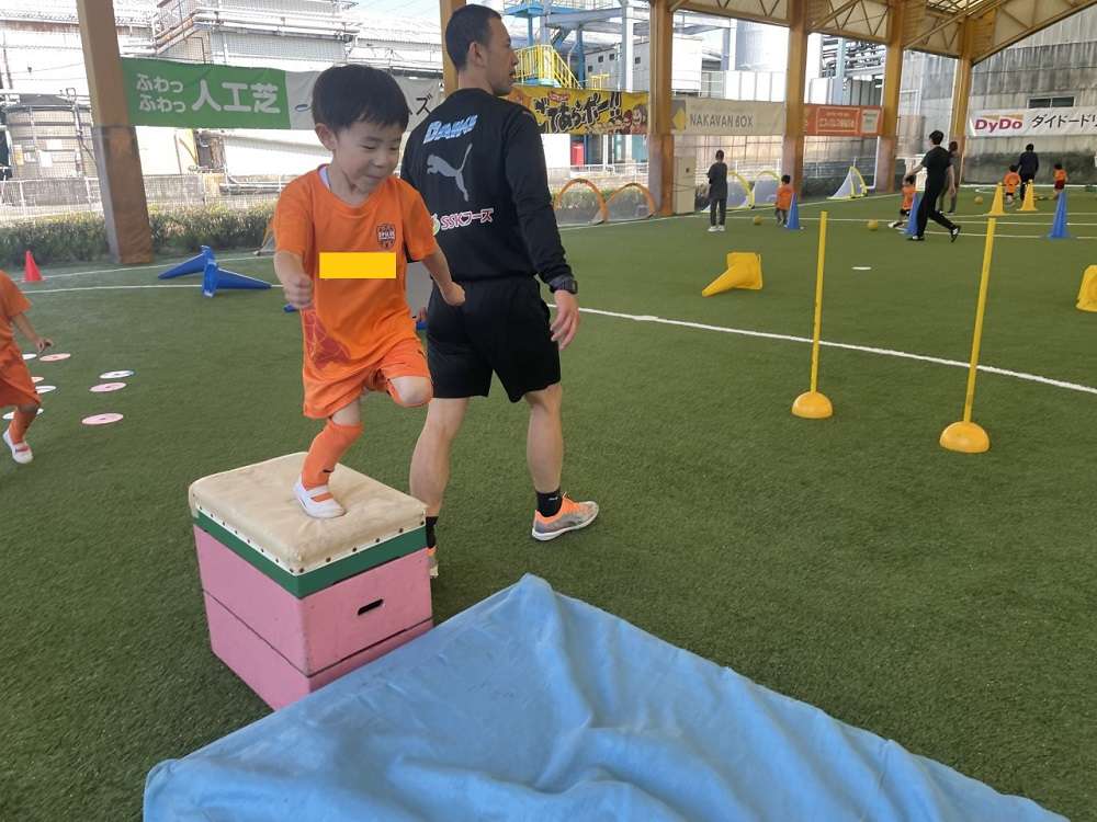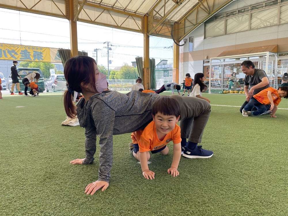 その後、跳び箱などの障害物のあるサーキットトレーニング。カラーコーンや障害物を親子で協力しながら攻略し、ゴールを奪うシュートトレーニングなどに取り組みました。