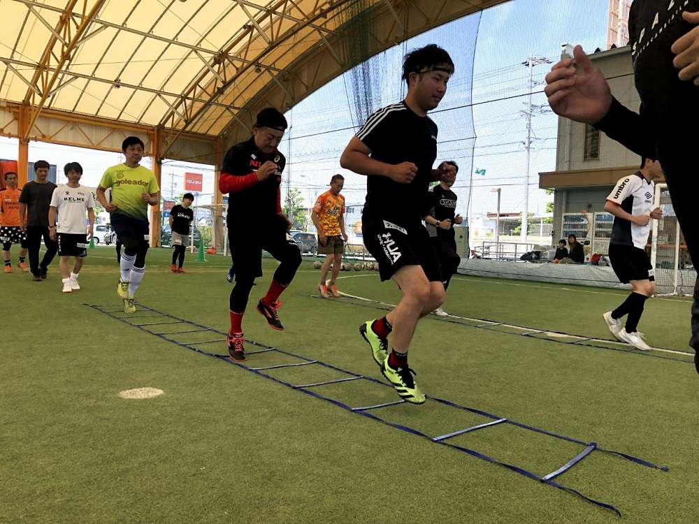 その後、ラダートレーニングを行いました。しっかり腕を振ること、ももを上げること、目線を上げることを意識して取り組みました。