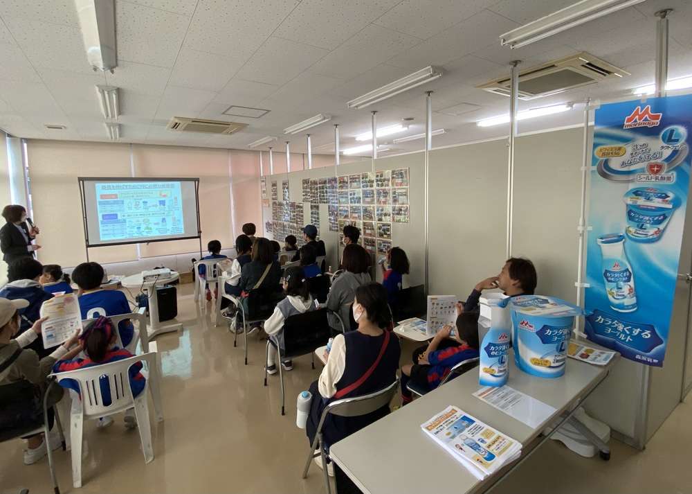 試合のブレイクタイムを活用して、森永乳業株式会社静岡支店様によるジュニアスポーツ栄養講座を開催いたします。ジュニア期に必要な栄養と睡眠/バランス食のコツ/運動時の食事等、森永製品をお試しできる試食・試飲ブースの出店もございます。