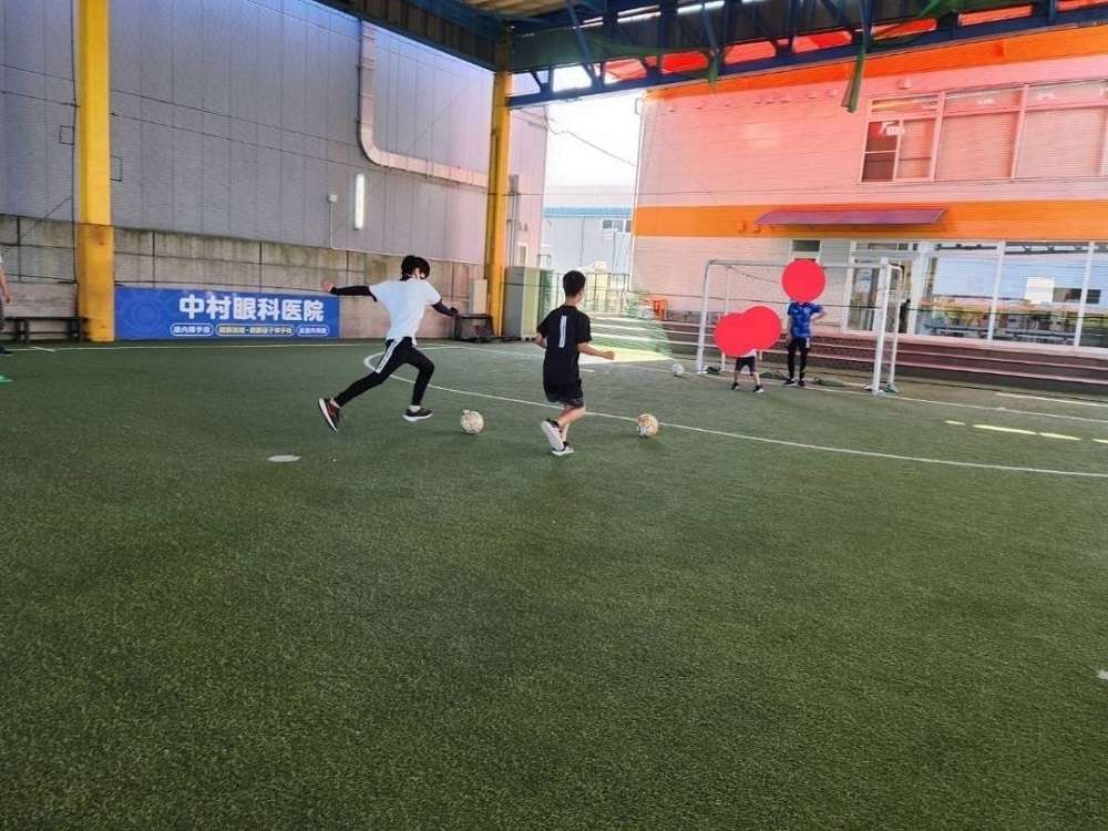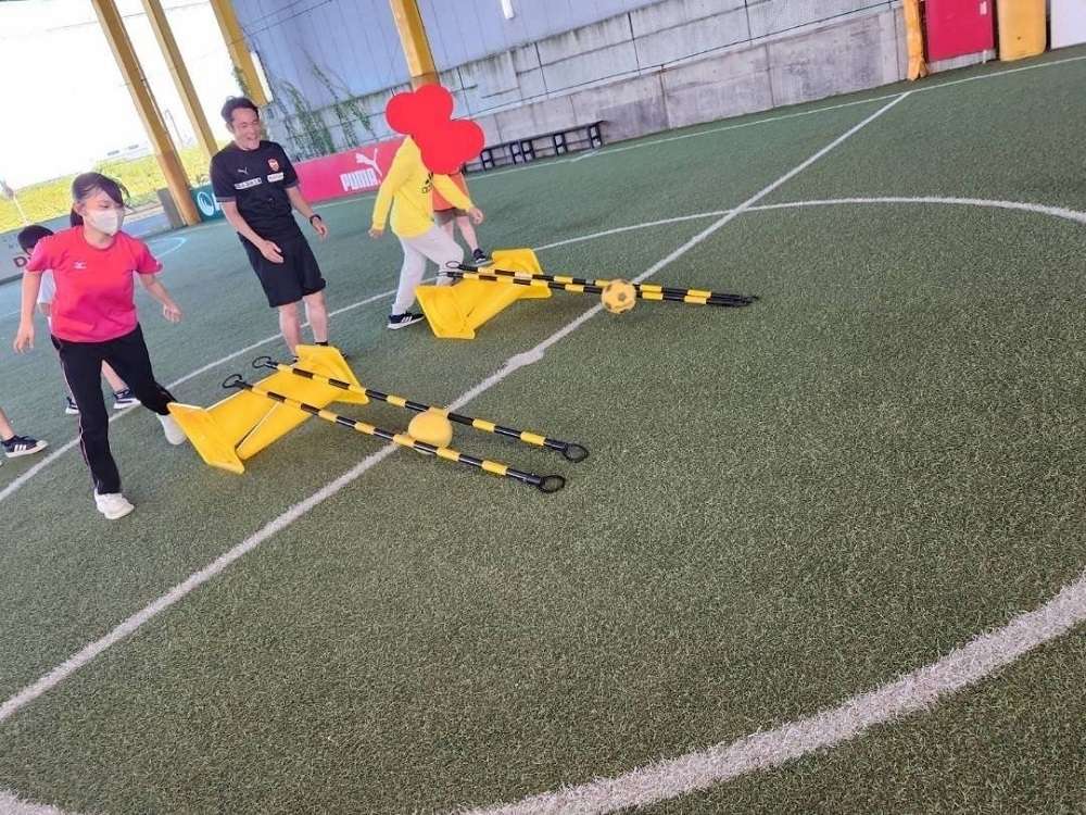 ピッチに入ると、自分からボールで遊んだり、友達とパス交換をしたり、スタッフの方と走り回ったり、元気に動き始めました!今回は、2人でのドリブルシュート対決を行いました。コーンとバーで発射台を作り、ボールを転がしてスタートします。競争相手に負けないように何度も挑戦しました!
