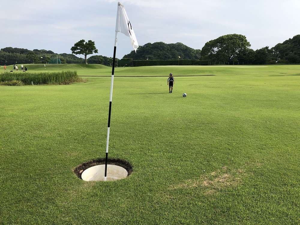 フットゴルフとは、サッカー×ゴルフという人気の高いスポーツを掛け合わせたスポーツです。ゴルフ場に作られた特設ホールを、ゴルフに近いルールでサッカーボールを蹴り、スコアを競い合います。