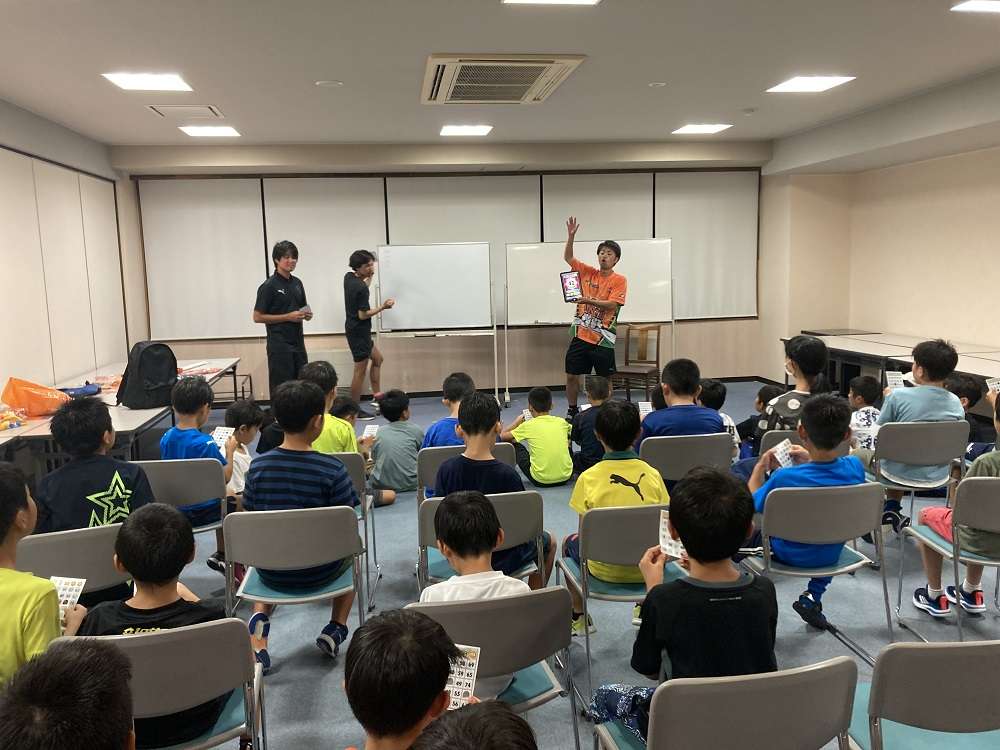 トレーニング前に「自発+自律=自立」について山田コーチより参加したスクール生へお話があり、自分のことは自分で行うこと、失敗を恐れず積極的に行動することをキャンプ中に心掛けることを約束しました。