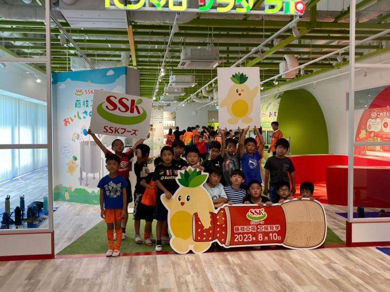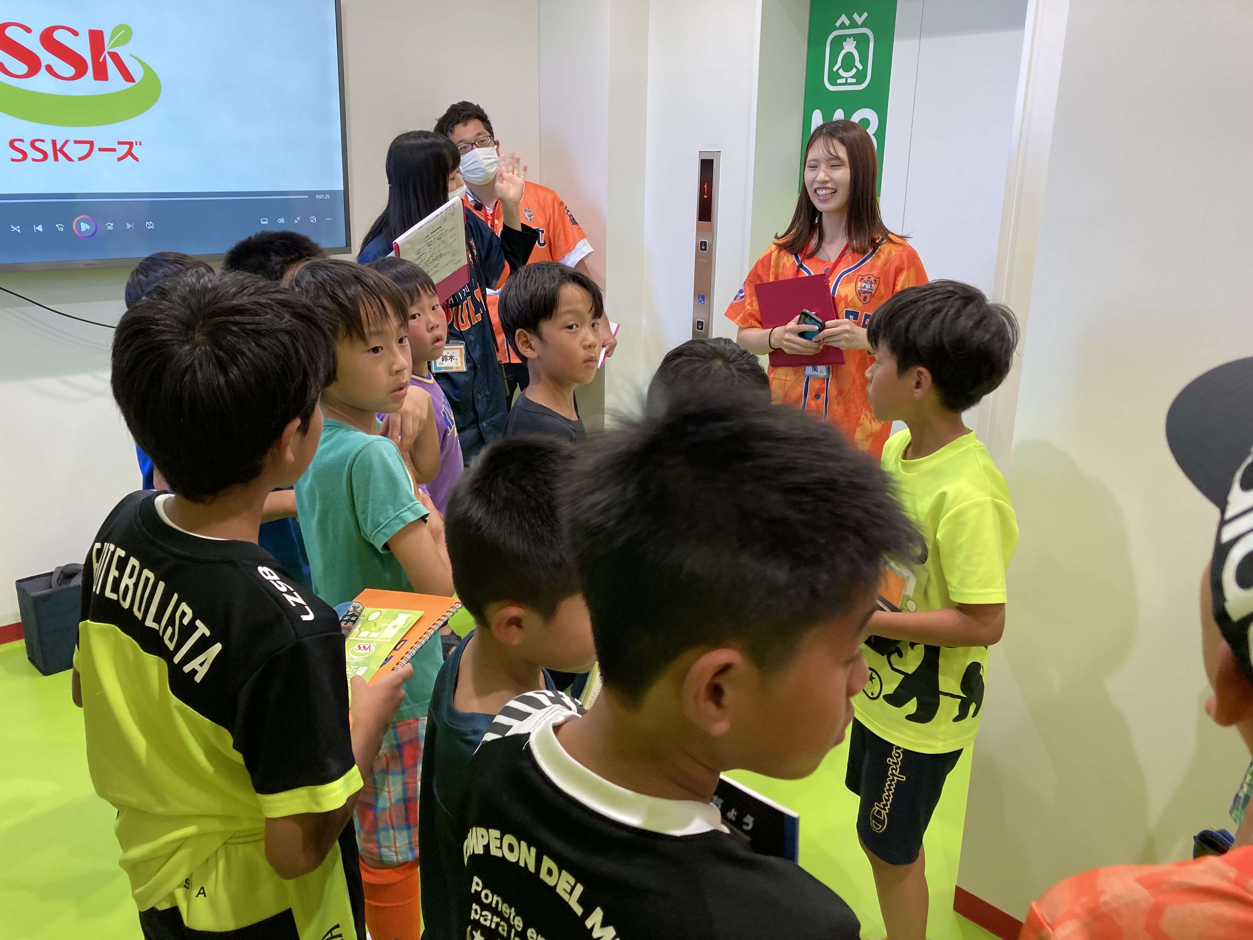 清水エスパルスのパートナーでもあるエスエスケイフーズ株式会社様の藤枝工場に着くと、多くの社員の皆様に迎えられた子どもたちは大きな施設に興味津々。