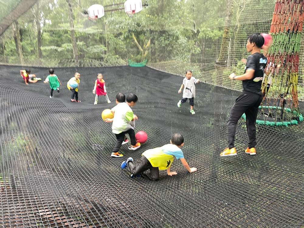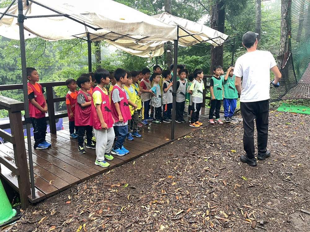 次はみんなが楽しみにしていた『森の空中あそび パカブ』。施設の方にもご協力を頂き、小雨になったタイミングで遊ぶことができました。施設のルール説明をしっかり聞いた後はコーチたちも一緒に空中へ!!雨の影響もあり、予定よりも少し短い時間でしたが、みんなの笑顔が最高でした。
