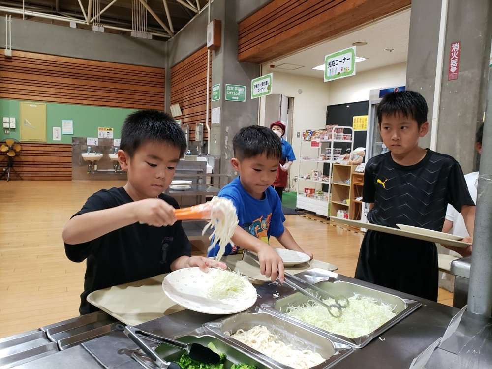 足柄ふれあいの村に到着すると、まずは昼食。まだ、ほとんどの子はまだ緊張した様子で、ここでは普段仲の良い友達同士で一緒にご飯を食べていました。