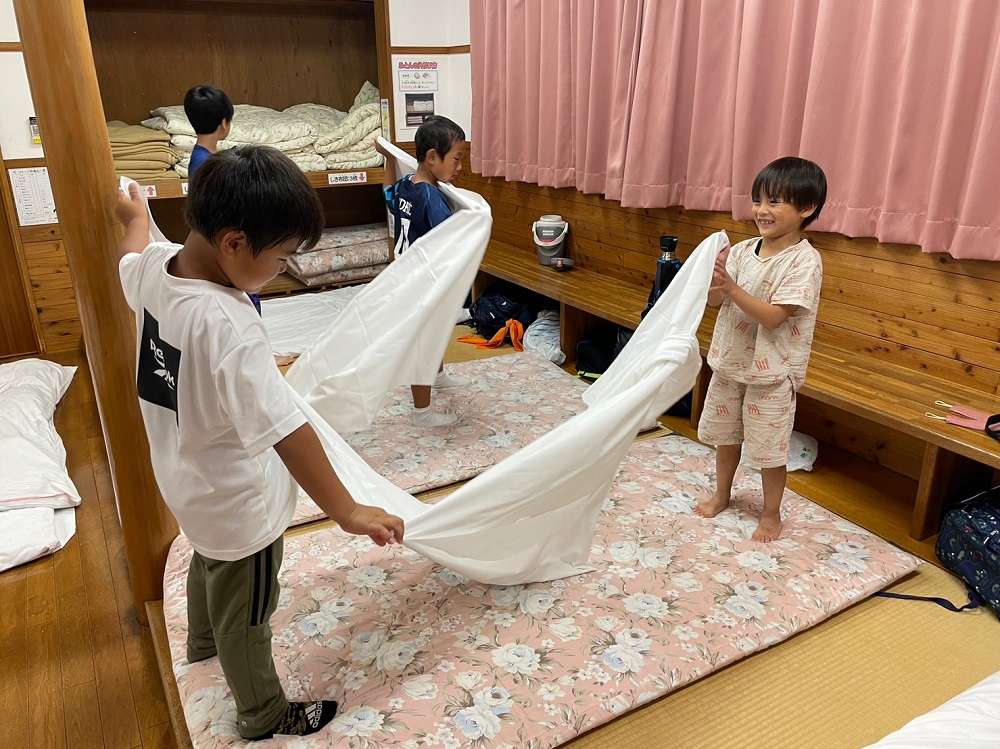 その後、各部屋に分かれ就寝準備。布団、シーツのひき方をコーチに教わりながら行いました。