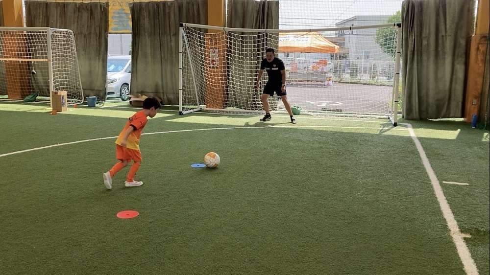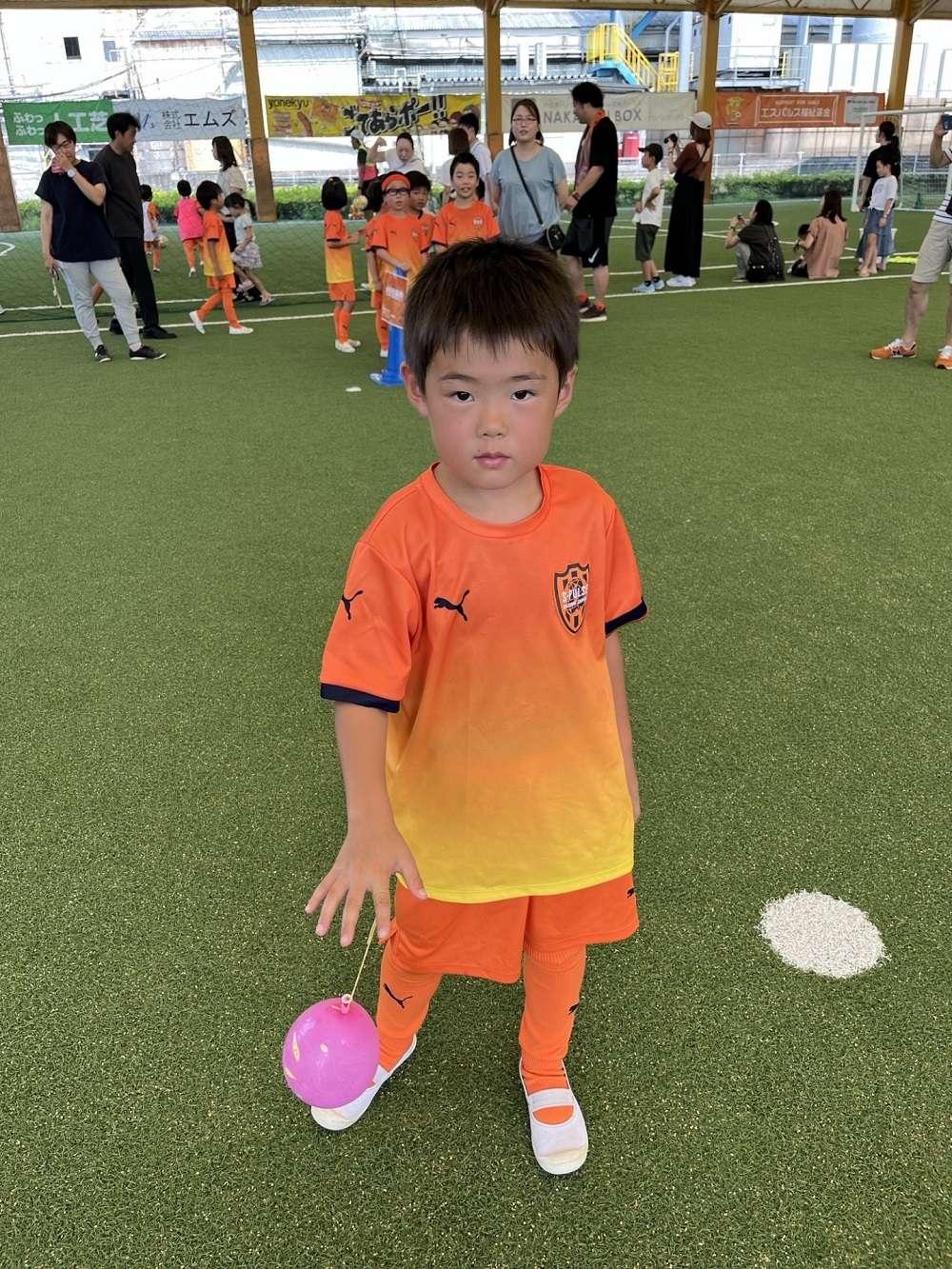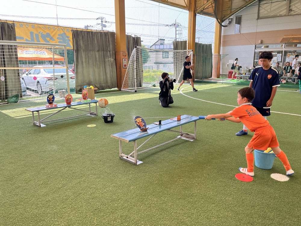 コート1面では試合形式のゲーム大会。保護者の声援もあり、白熱した試合が繰り広げられました。もう1面はアトラクションコート。PK対決、キックターゲット、サッカーゴルフ、フリーキック、水鉄砲と内容も盛りだくさん。物販ブースでは、特別価格の田子の月お菓子セットや、スクールオリジナルタオルマフラーの販売など、夏祭りの雰囲気に華を添えました。