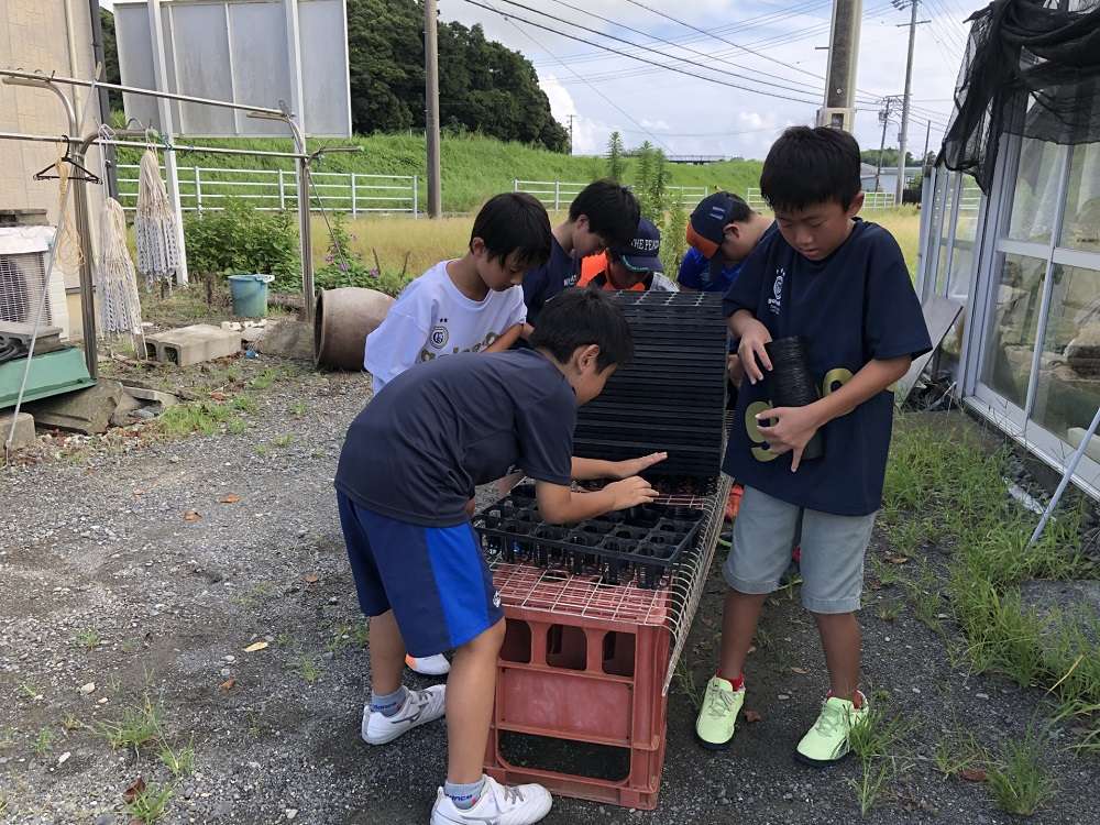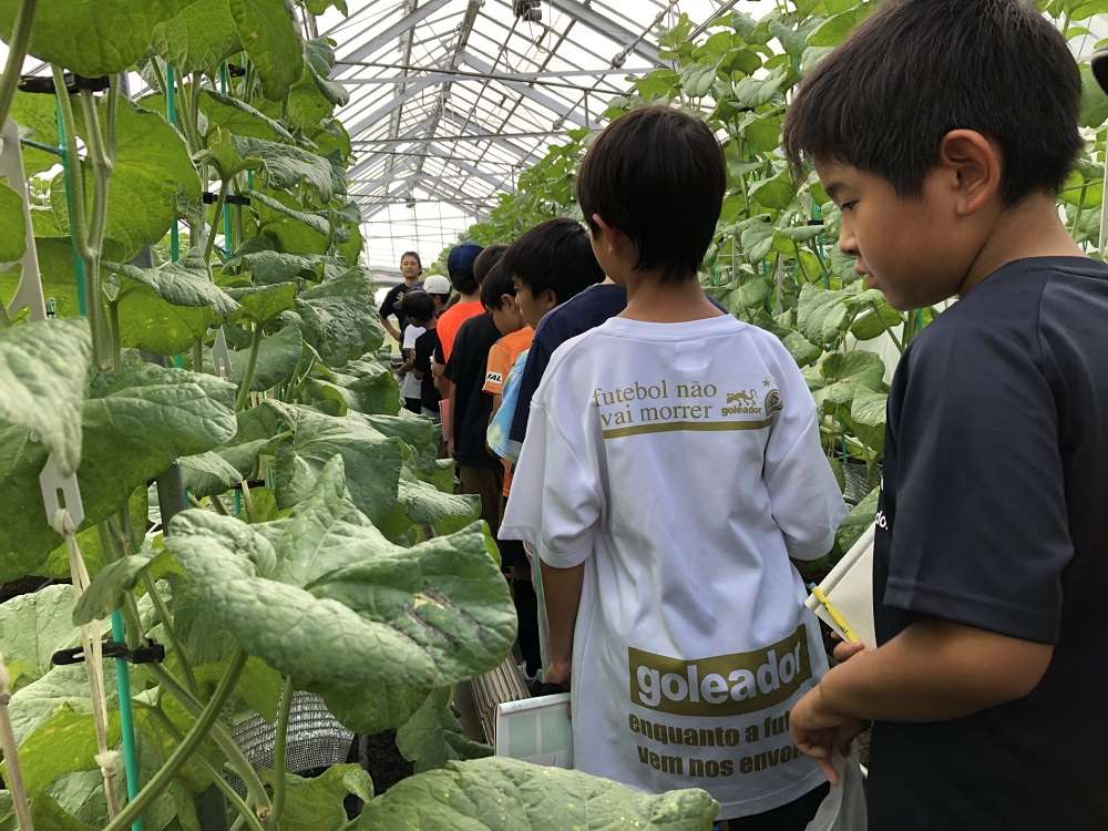 メロンを栽培するまでの過程や10棟あるハウスの細かな設備などを説明していただき、子どもたちはメモを取りながら真剣に聞いていました。その後、グループに分かれてお仕事のお手伝いをし、どれだけ素早く正確に行えるかの競争を行いました。お仕事の大変さを体験し実感することが出来ました!