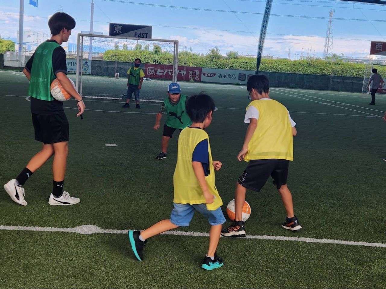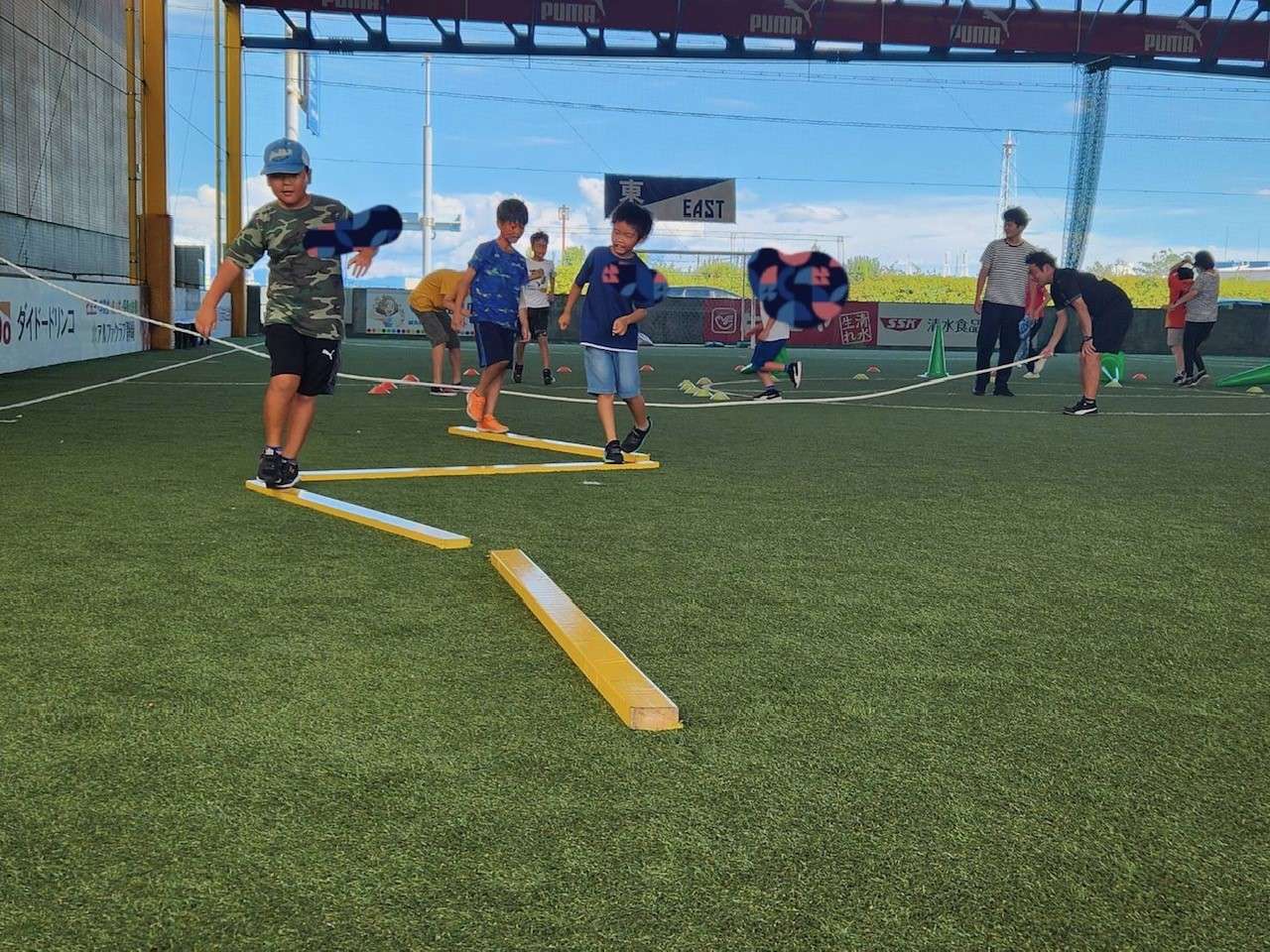 東新田と石田の子どもたちが今年度2回目です!久しぶりに会う子たちは、「もりコーチ!久しぶり~!」「今日も暑いね~!」と暑さに負けず元気いっぱいの様子。そして何人かは初参加の子もいました。初参加の子は少し緊張している様子でしたが、こちらが元気に挨拶をすると「こんにちは!よろしくお願いします。」と元気に答えてくれました!