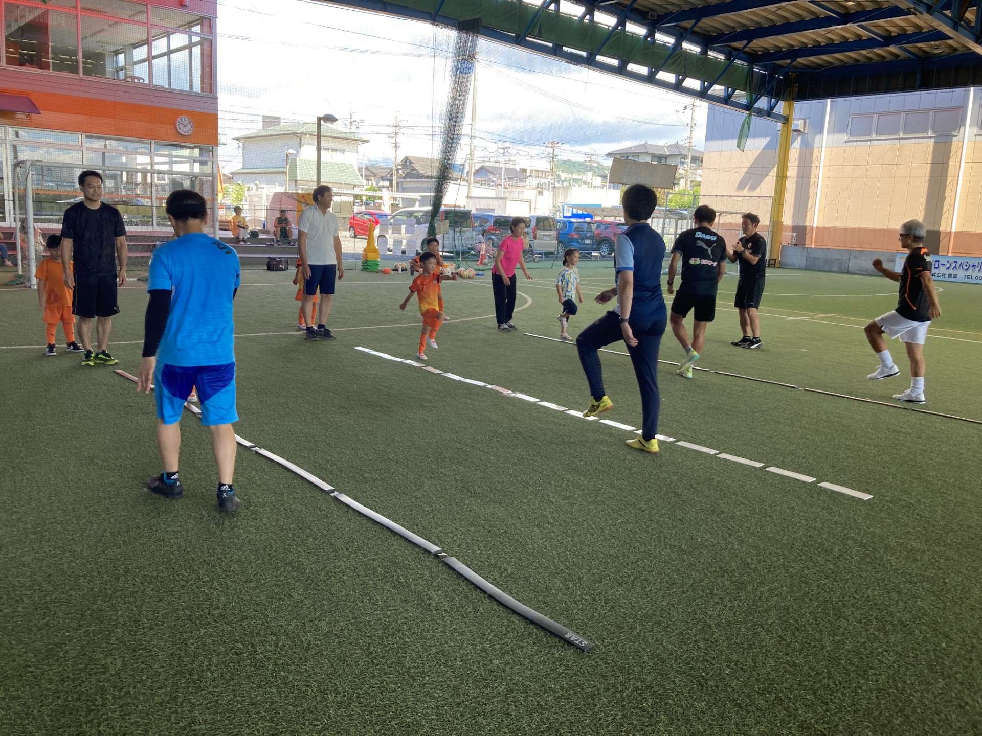サッカー教室の前には、ふうまコーチによるリズムステップトレーニングを行いました。