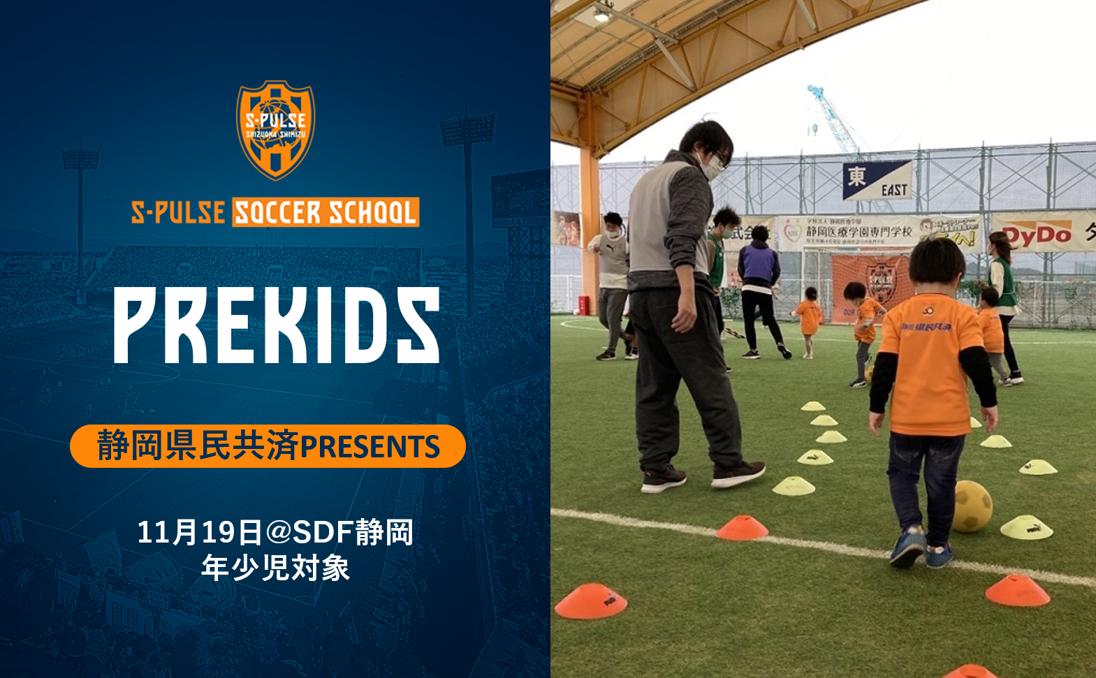 清水エスパルスは、クラブパートナーである静岡県民共済さまご協力のもと、11月19日(日)にエスパルスドリームフィールド静岡にて、年少児の子ども1名と保護者1名の親子を対象とした『静岡県民共済 presents 親子で一緒に年少さんサッカー教室』を開催いたします。