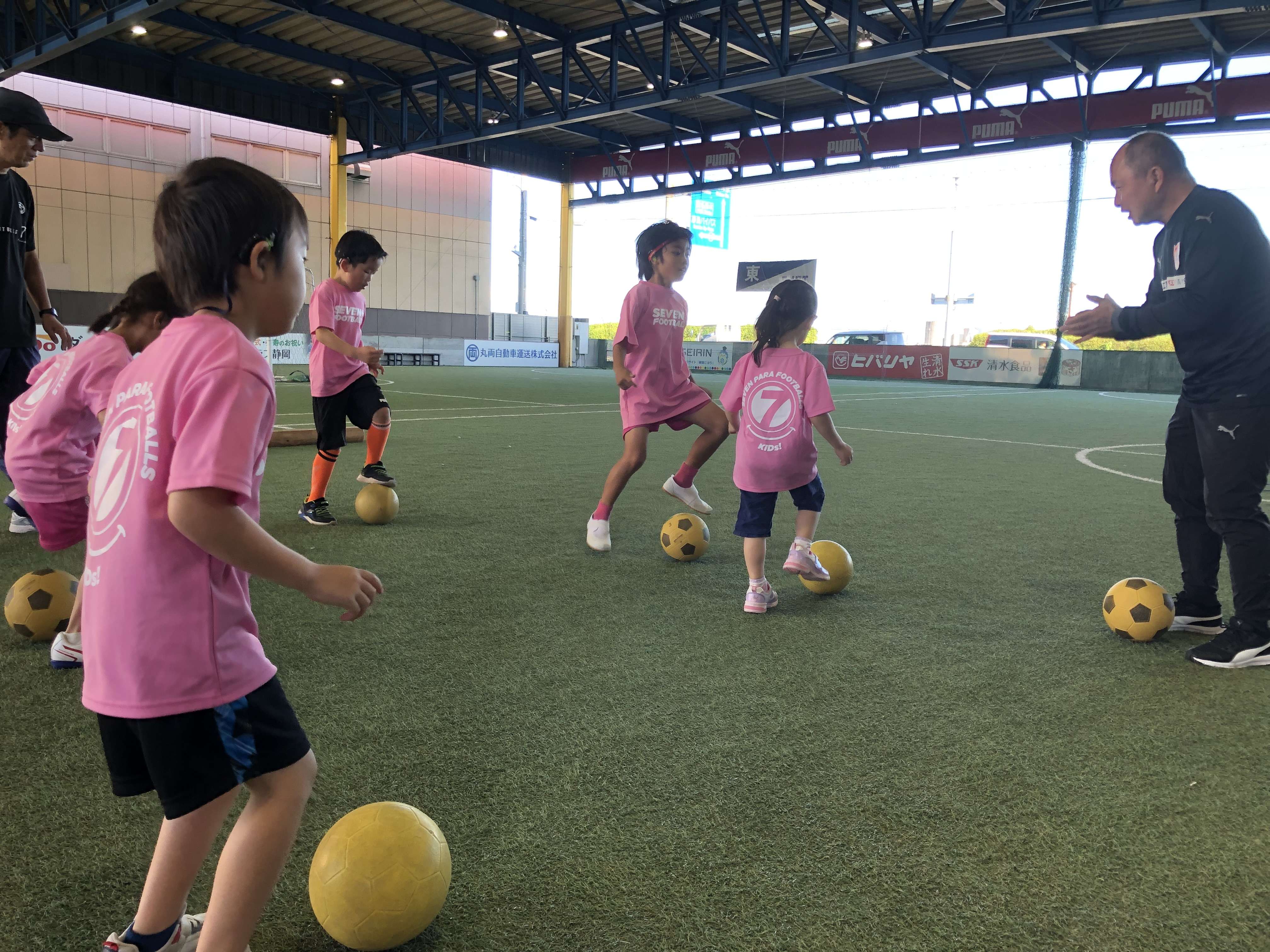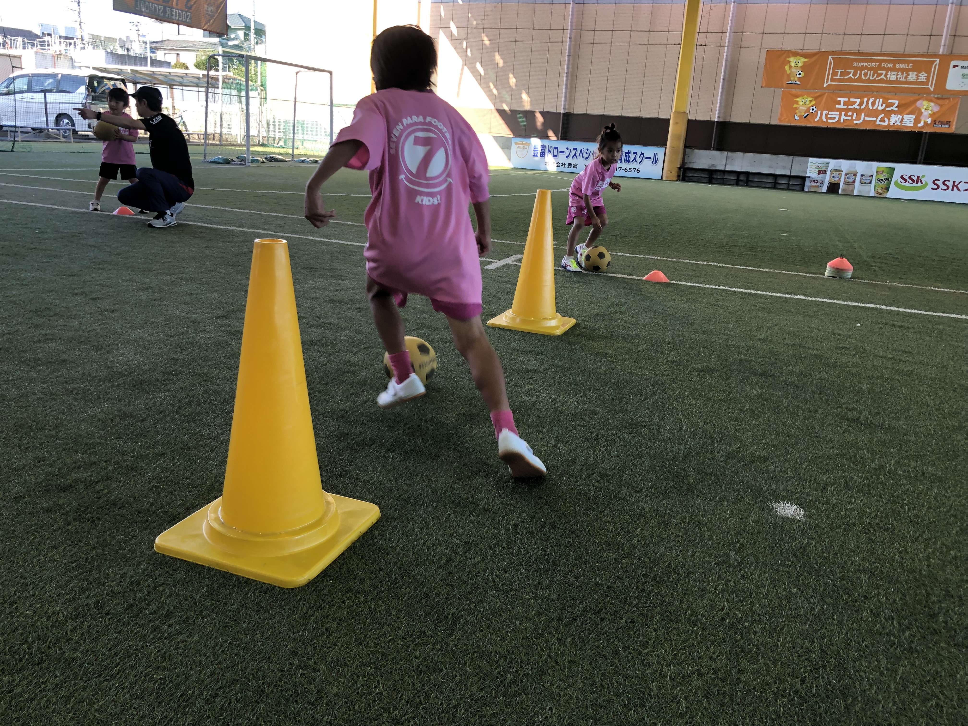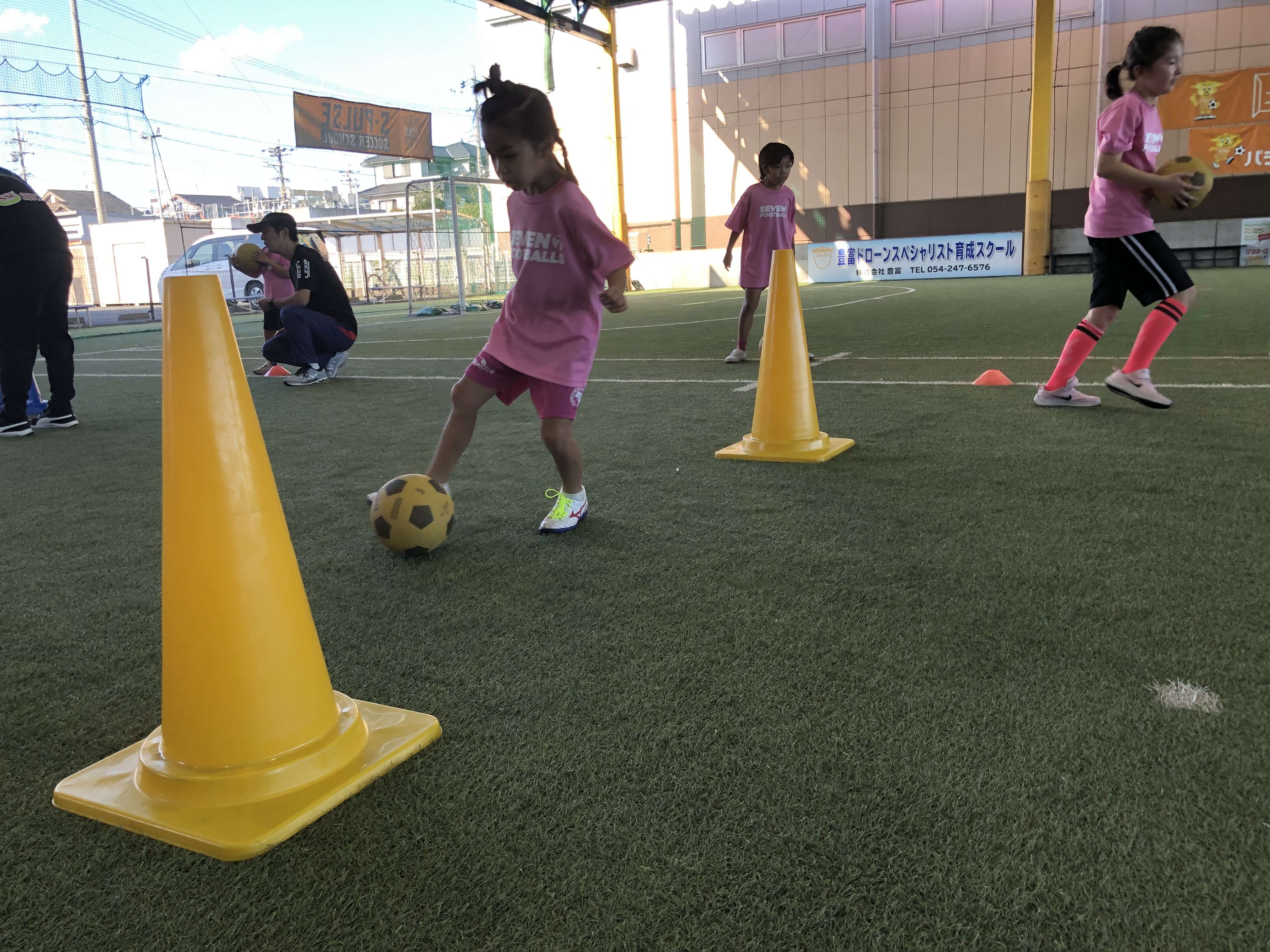 ドリブル練習では、両足を使って8の字ドリブルを行い、シュート練習では向かってくるボールに対し、キーパーを観てシュートをしていました。