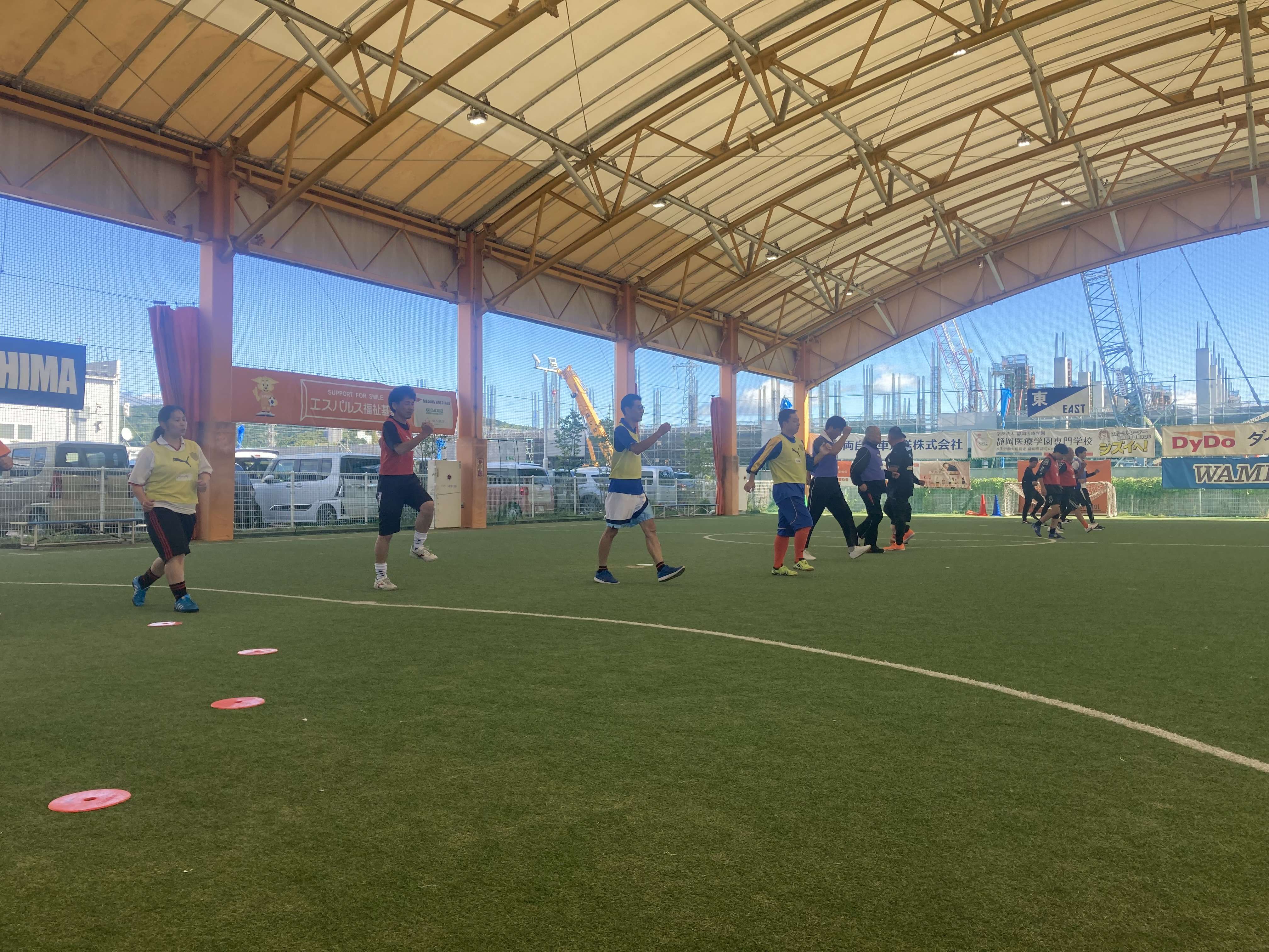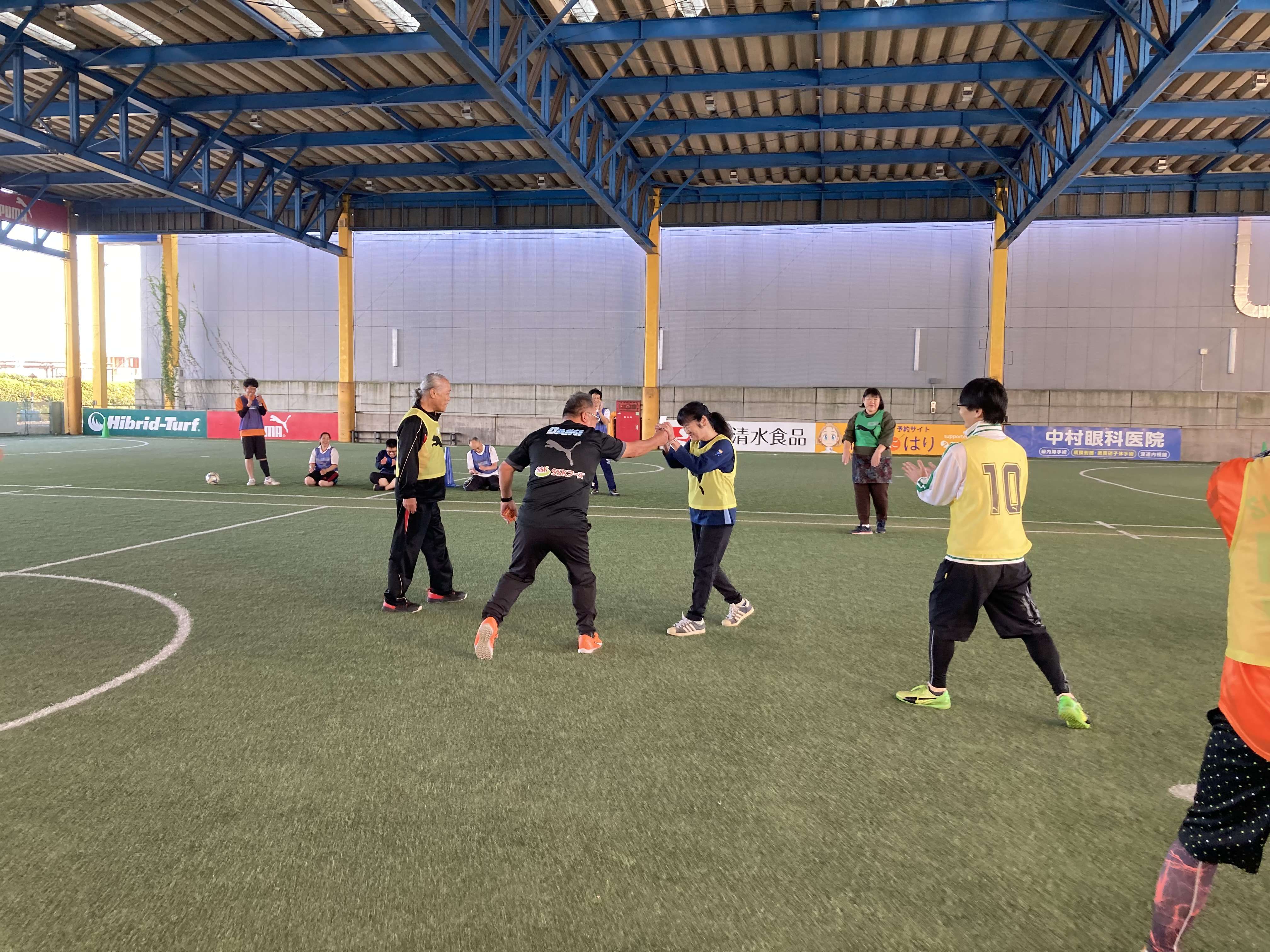 試合前には、「ドリブル体験(ペンギンドリブル)」、「シュート」を体験して、最後はチームに分かれて時間まで試合を行いエスパルスウォーキングフットボール独自のローカルルールをつくり面白おかしく試合を楽しんでいただきました。