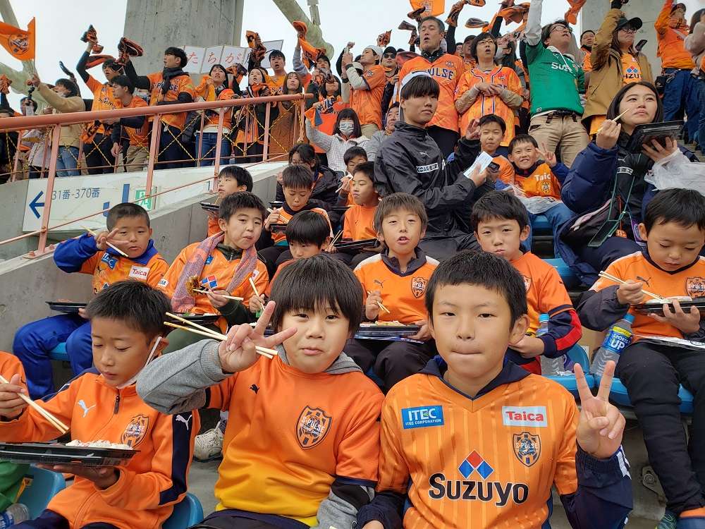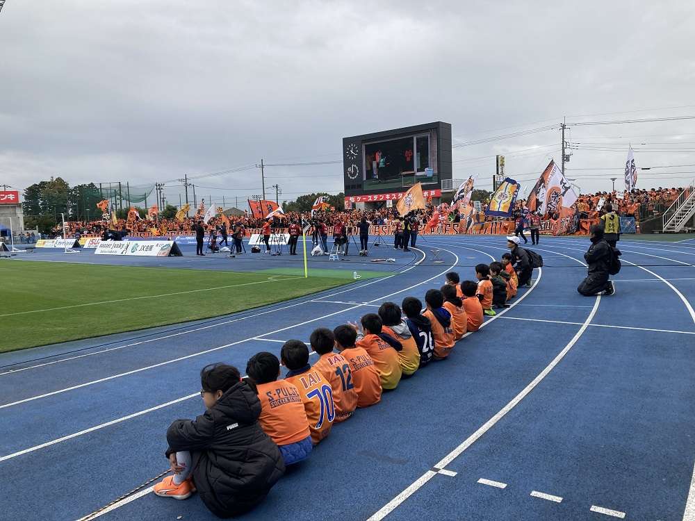 試合は1対1のドロー決着となり、残念ながらJ1昇格の瞬間に立ち会うことはできませんでした。それでもスクール生たちは『絶対に諦めないぞ!!』『あと2試合、全力で応援する!!』とTOPチームの選手に向けて熱い声援を送ってくれていました。