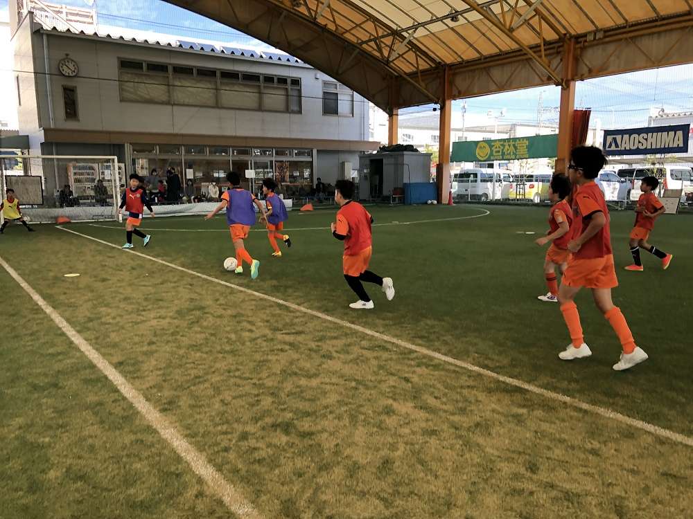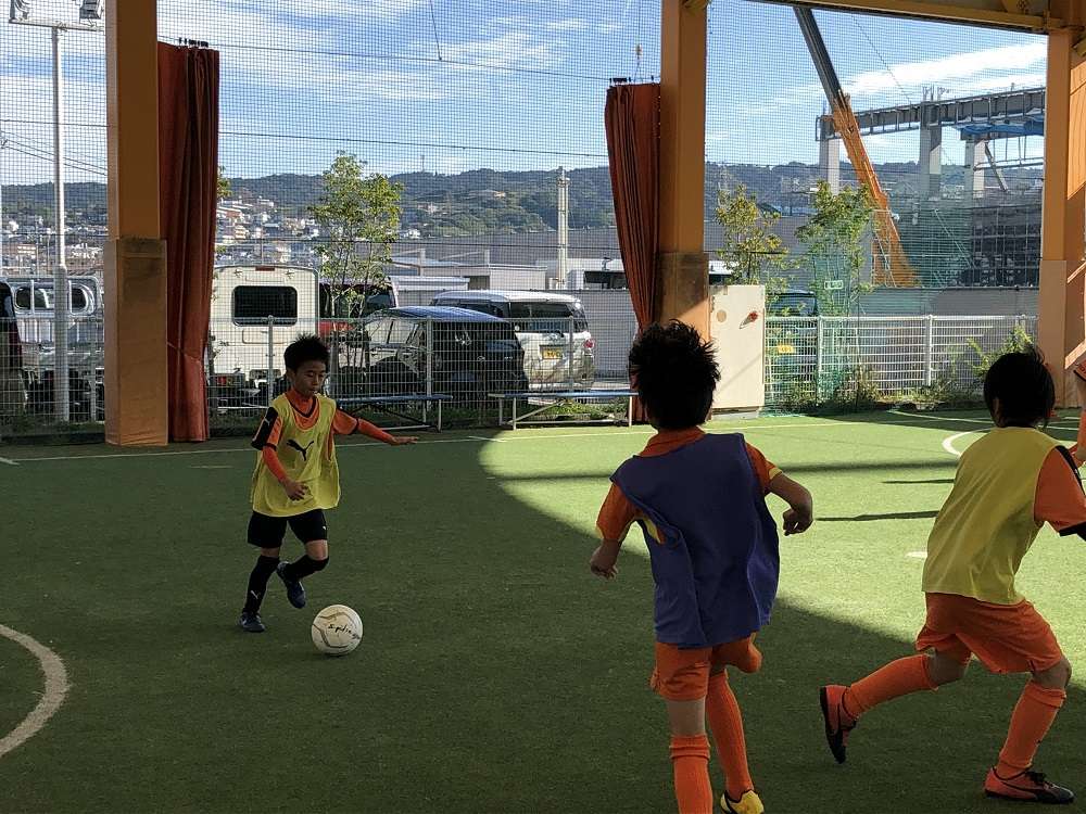 フルピッチゲームスクールとは、エスパルスドリームフィールド静岡のフットサルコート2面を繋げて、広いピッチを使用したコートで3チーム総当たり戦(2周行う)の試合を行うスクールのことです。